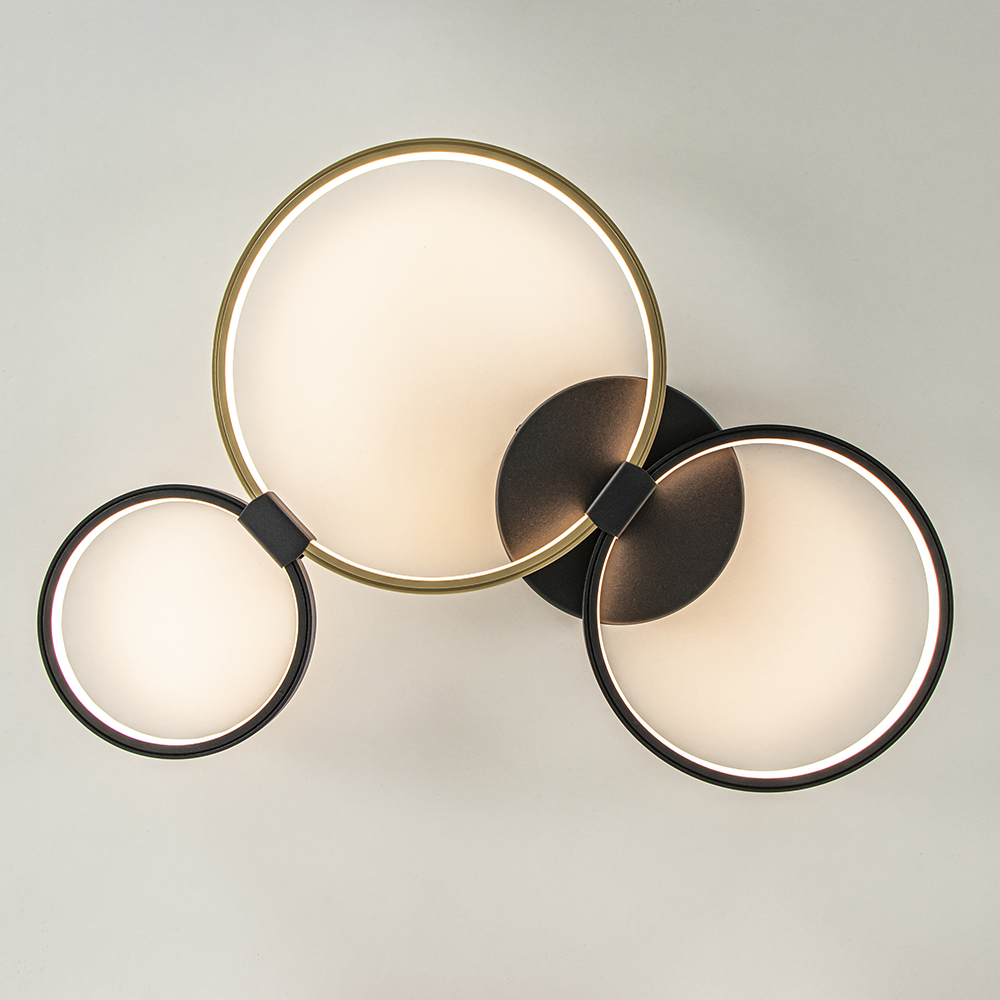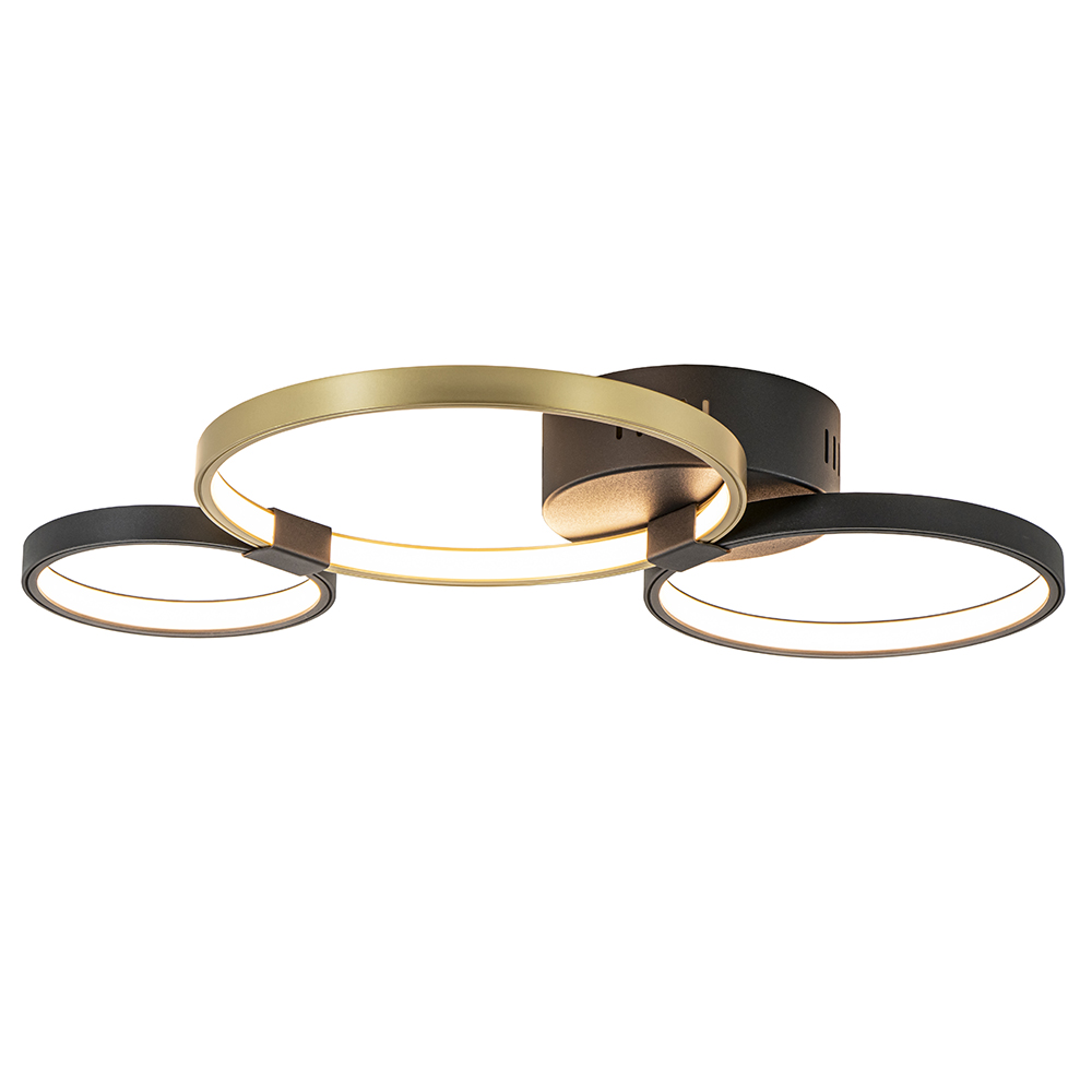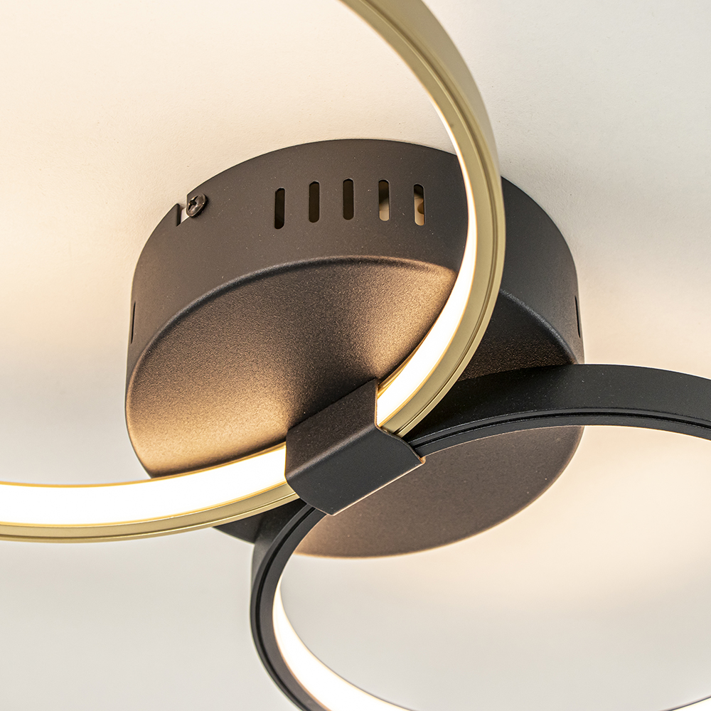 Een leuk design met een moderne techniek. Deze moderne plafondlamp bestaat uit 3 ringen die schuin met elkaar zijn verbonden en daardoor een speelse look krijgt. De zwart met gouden ringen zijn aan de binnenzijde voorzien van een LED strip die met 2700 Kelvin zorgen voor een sfeervolle warm witte verlichting. Het fijne aan deze zwart/gouden plafondlamp is dat deze is voorzien van een 3-standen dim functie. Dit houdt in dat u de plafondlamp met uw gewone wandschakelaar kunt dimmen door deze achter elkaar aan en uit te zetten. De plafondlamp begint op z’n felst en dimt dan per keer dat u de schakelaar overhaald. Zo kunt u gemakkelijk en snel de gewenste sfeer creëren. Ideaal voor in een woonkamer of slaapkamer.