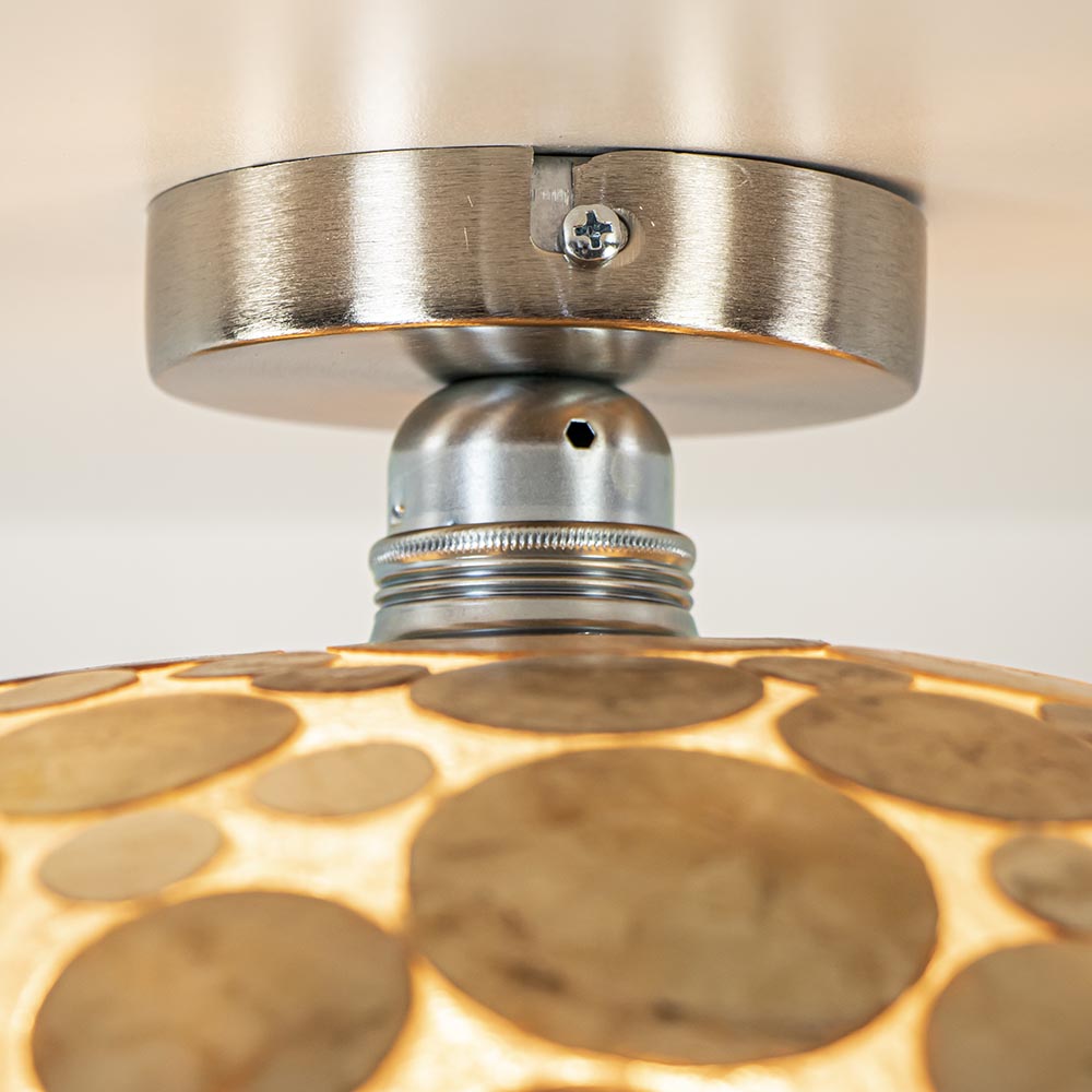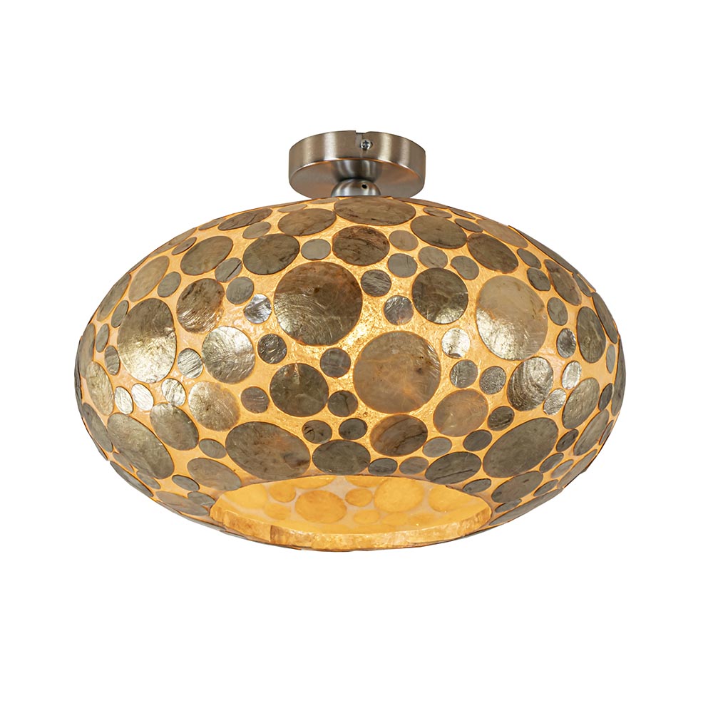 Deze handgemaakte plafondlamp is een echte eyecatcher. Deze leuke plafondlamp hangt leuk in de hal of in de slaapkamer. Hij wordt met de handgemaakt en dat maakt iedere lamp uniek. De plafondlamp heeft een warme sfeervolle uitstraling zowel in als uitgeschakeld. De ronde schelpen plafondlamp wordt exclusief lichtbron geleverd.