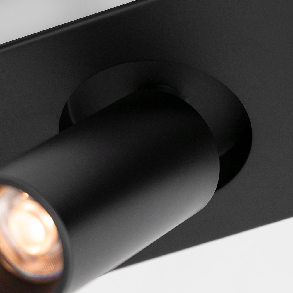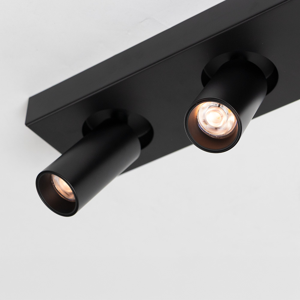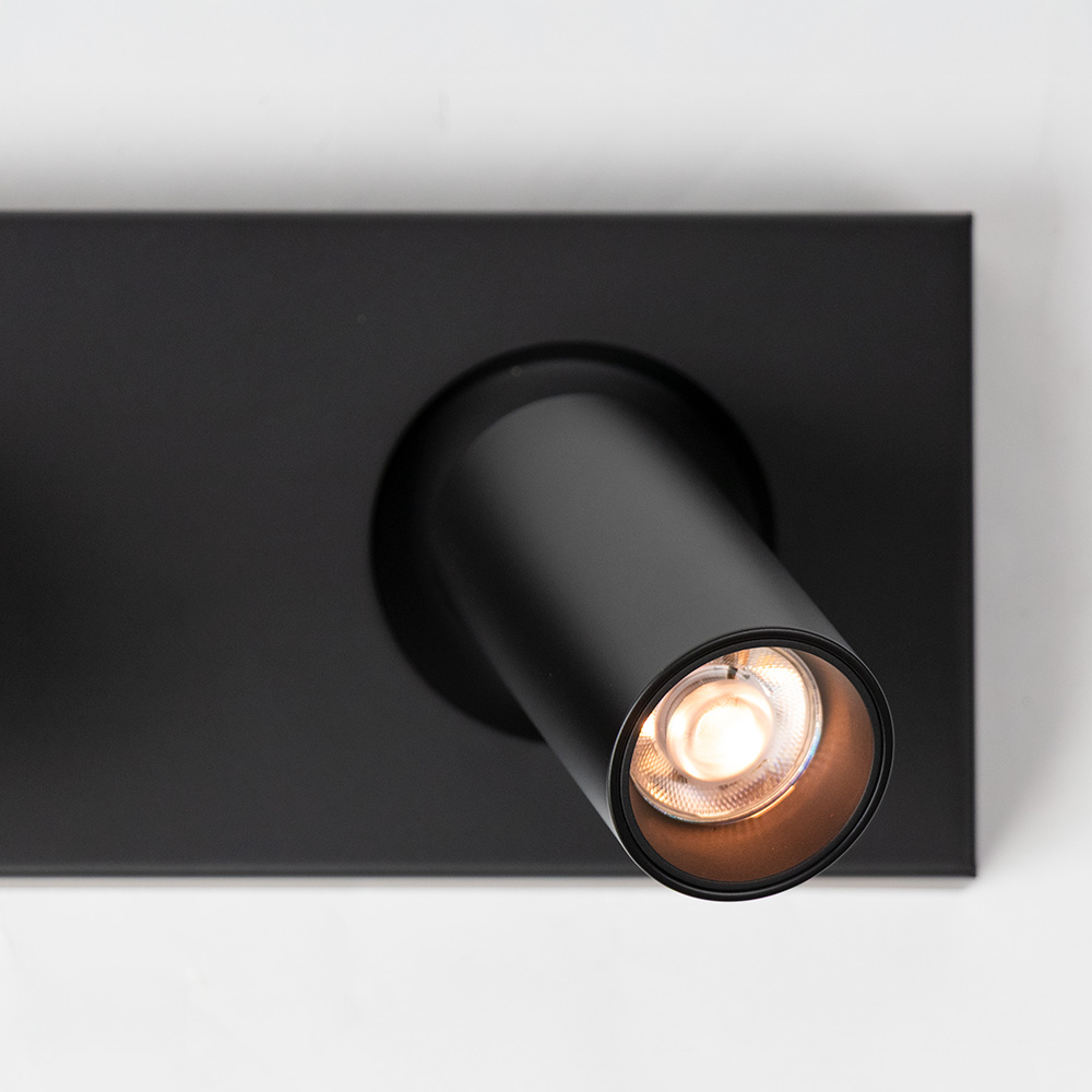 Details: – Afmetingen: 10x48x11,8 m – Bevestiging: 10x48x3,2 cm – Kap: Ø4,2 x 8,5 cm – Materiaal: Metaal – Kleur: Mat zwart – Draai- en kantelbaar – Fitting: GU10 mini (lichtbronnen niet inbegrepen)