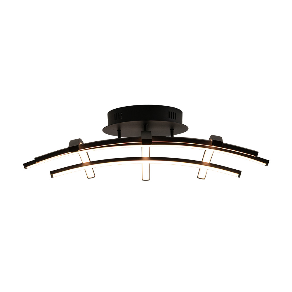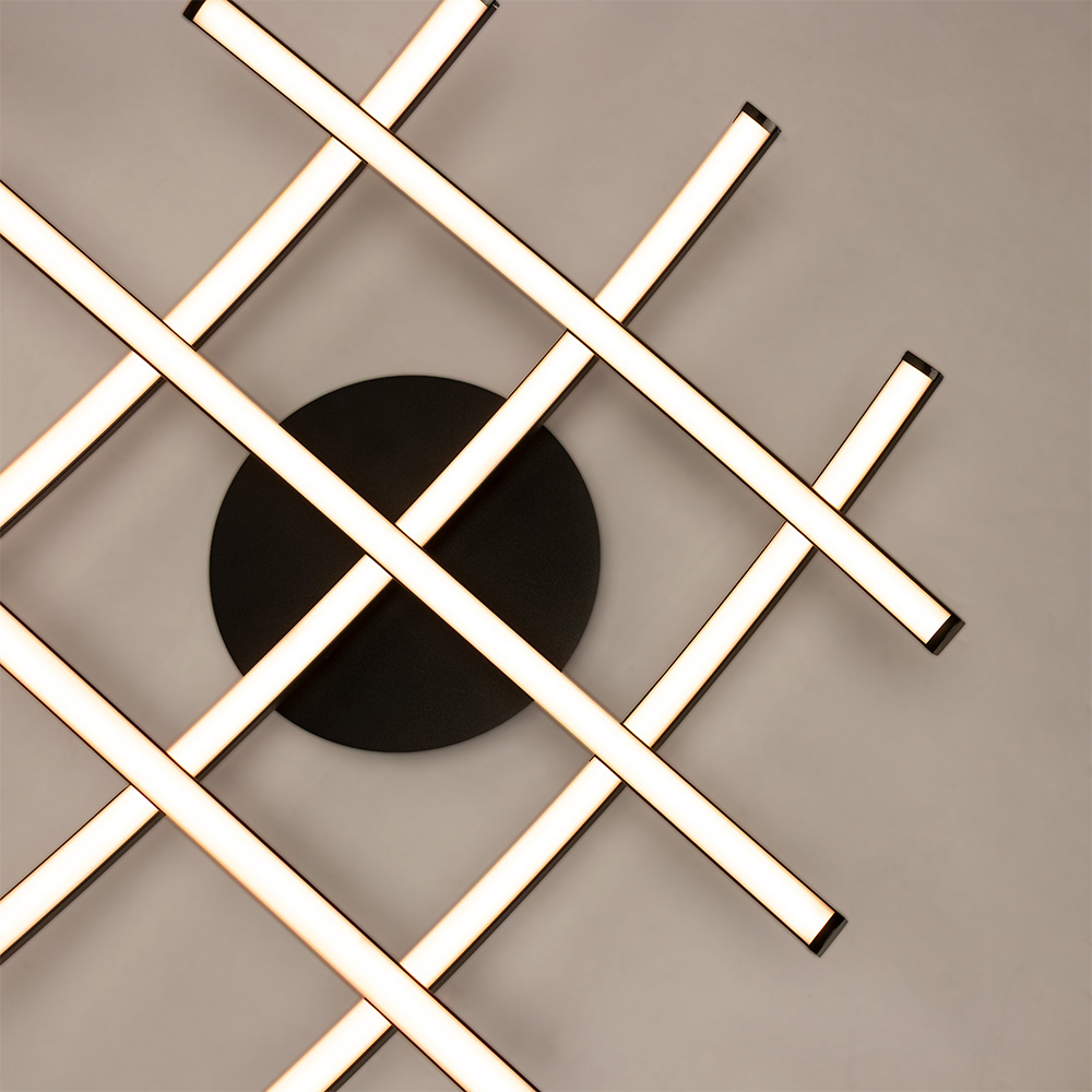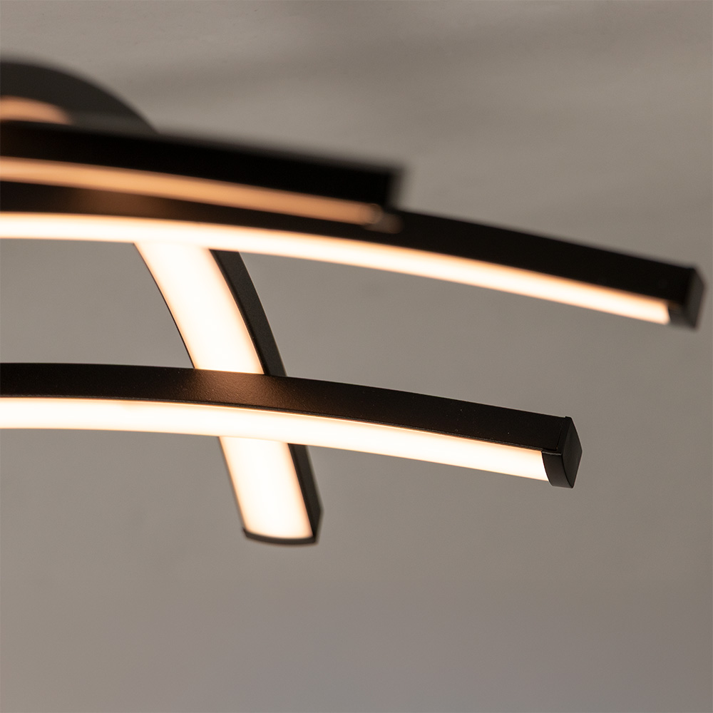 Deze moderne LED plafondlamp is een ware eyecatcher dankzij het opvallende geometrische ontwerp. De lamp bestaat uit meerdere gebogen lichtlijnen die elkaar elegant kruisen, wat zorgt voor een dynamisch en stijlvol geheel. De zwarte afwerking geeft het armatuur een moderne, industriële uitstraling, terwijl de geïntegreerde LED-verlichting zorgt voor een krachtig en gelijkmatig warm wit licht. Dankzij de platte constructie is deze lamp ideaal voor ruimtes met een lagere plafondhoogte, zoals de hal, woonkamer of werkkamer. De combinatie van design en functionaliteit maakt deze plafondlamp een perfecte keuze voor wie op zoek is naar eigentijdse verlichting met karakter.