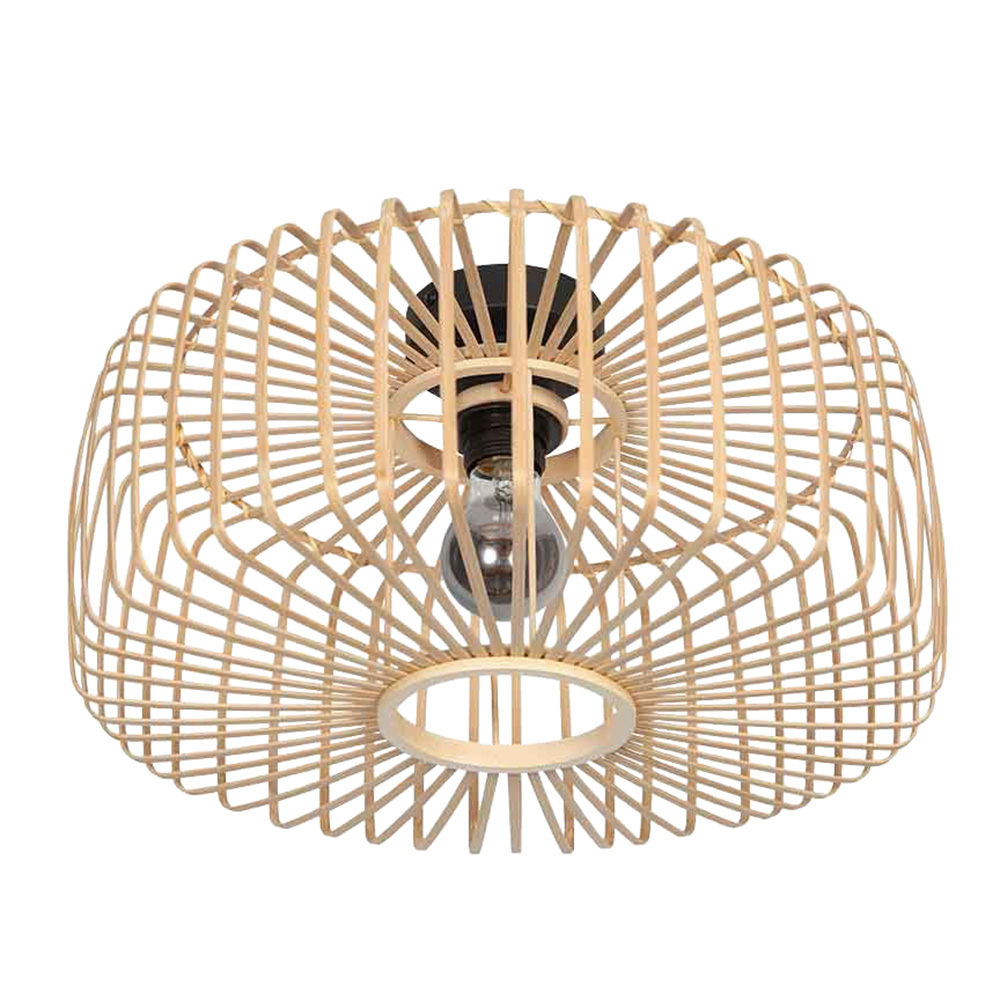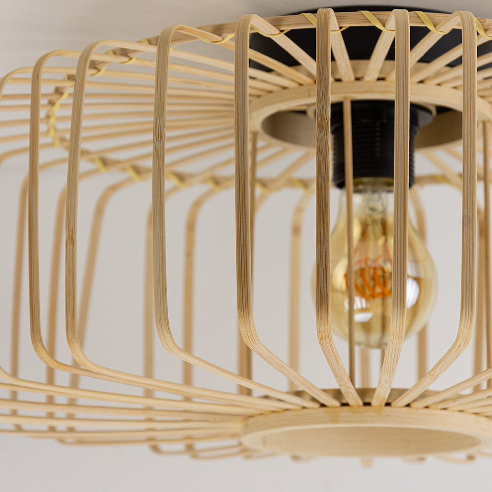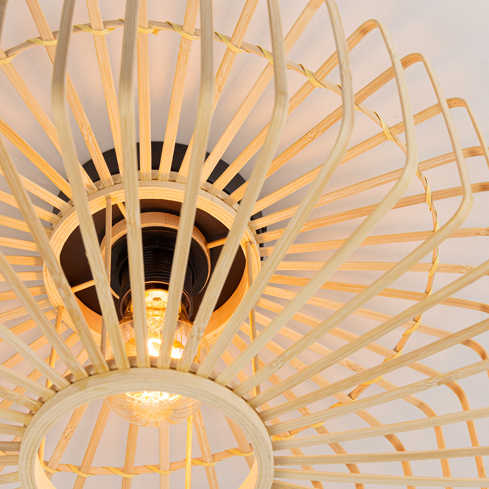 Creëer een warme en natuurlijke sfeer in je interieur met deze decoratieve plafondlamp van. Het luchtige, open design van de naturel bamboe lamellen zorgt voor een speels lichteffect op het plafond en de muren. De zwarte plafondbevestiging vormt een stijlvol contrast met de lichte houttint en maakt deze lamp geschikt voor uiteenlopende woonstijlen: van Scandinavisch tot bohemian en modern.