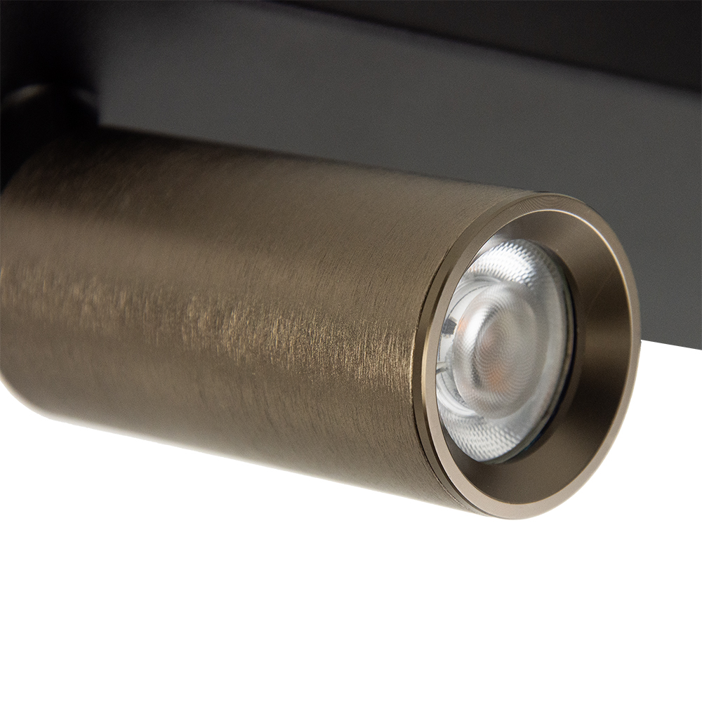 Deze elegante plafondspot met twee verstelbare spots combineert modern design met een warme uitstraling. De bronzen, cilindervormige spotkoppen zijn bevestigd op een strakke, zwarte balk, wat zorgt voor een stijlvol contrast en een luxe look. Een perfecte keuze voor wie houdt van een verfijnde, moderne interieurstijl.