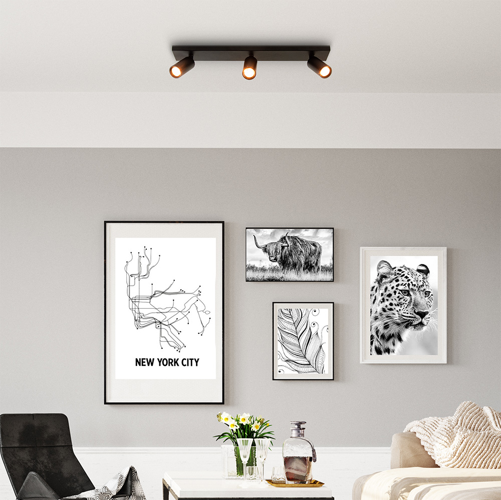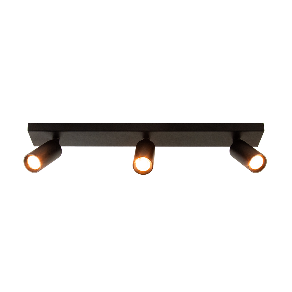 Deze moderne plafondspot met drie verstelbare spots is de perfecte combinatie van functionaliteit en stijl. De lamp heeft een langwerpige matzwarte basis en drie draaibare, cilindervormige spots. Het minimalistische ontwerp sluit naadloos aan bij een strak, industrieel of Scandinavisch interieur.