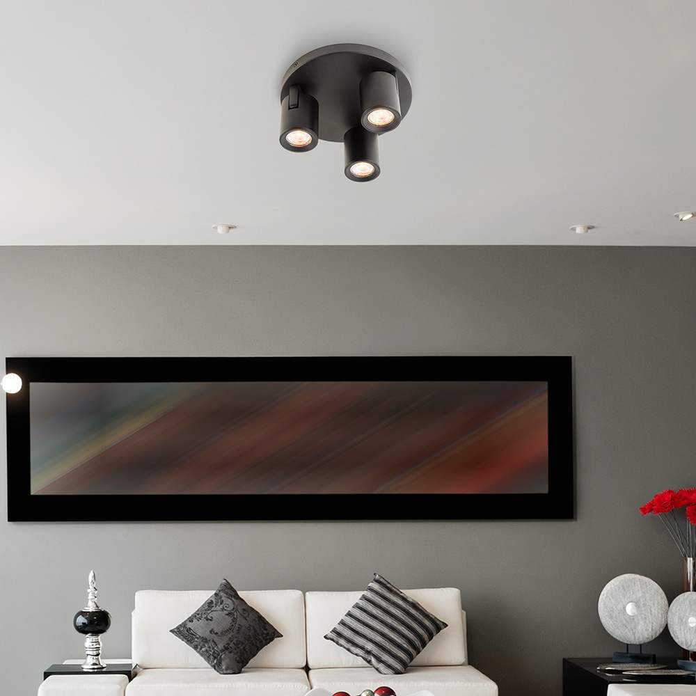 Deze moderne plafondspot met drie richtbare spots combineert stijl met functionaliteit. De strakke, matzwarte afwerking en het cilindervormige ontwerp zorgen voor een eigentijdse uitstraling die moeiteloos past in uiteenlopende interieurstijlen, van industrieel tot minimalistisch.