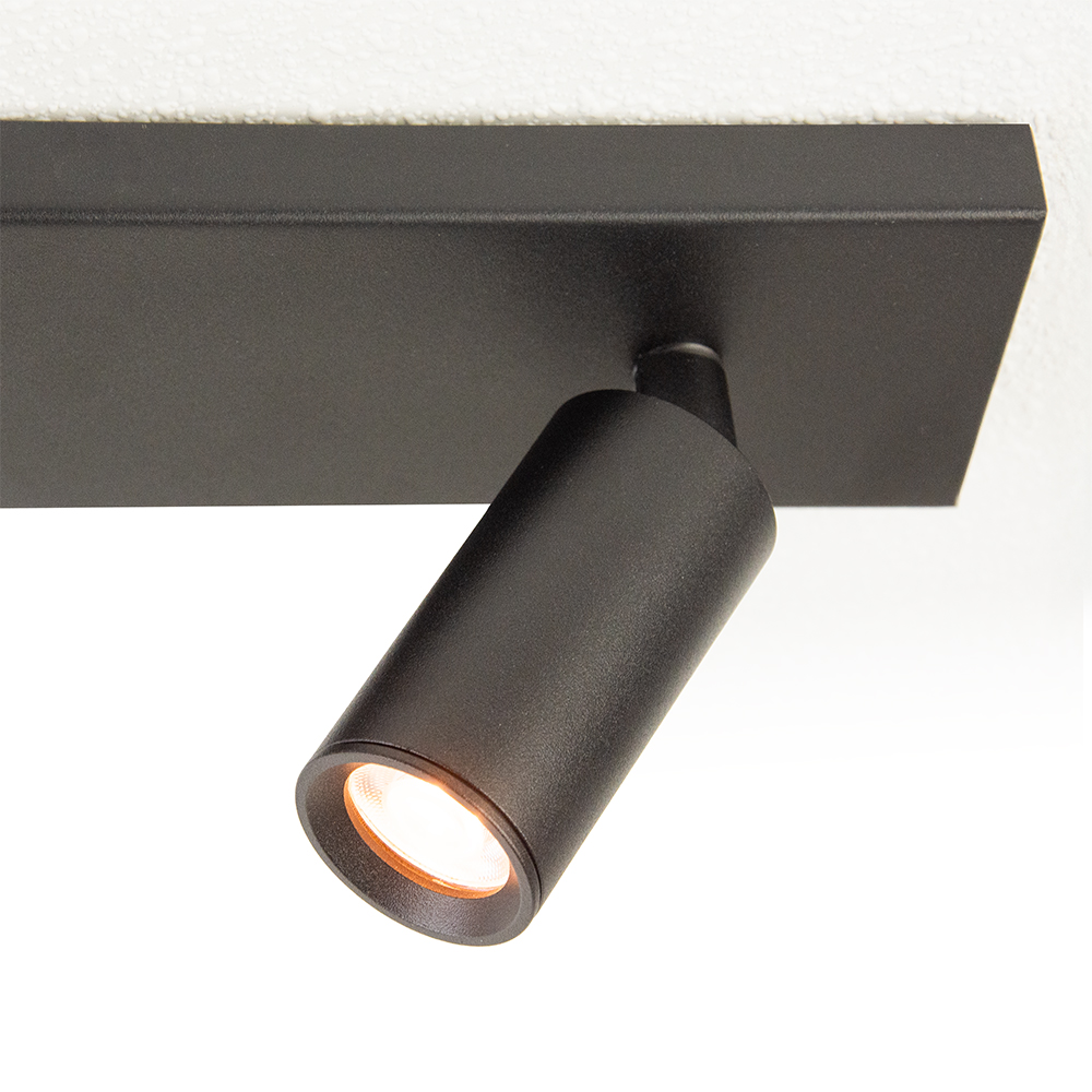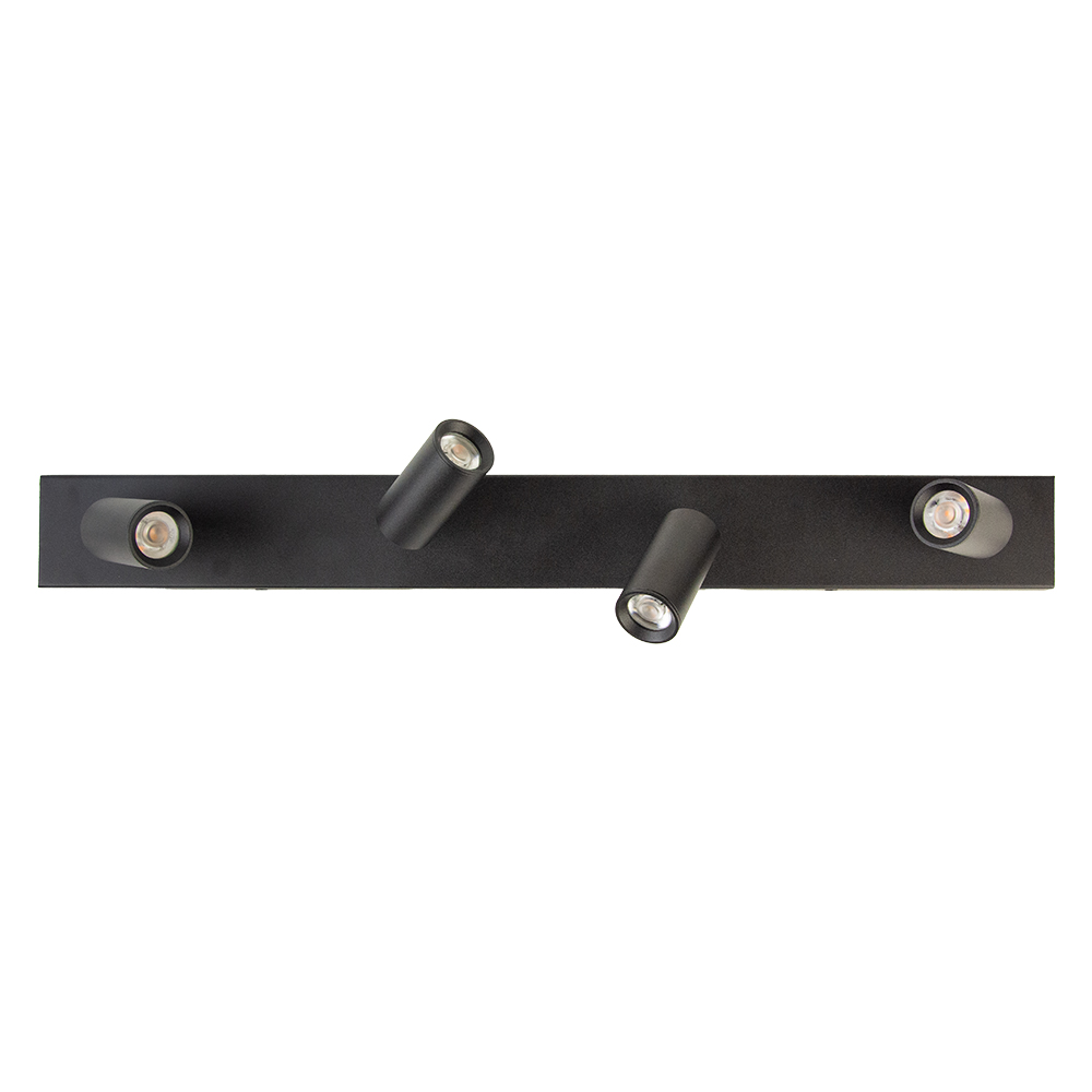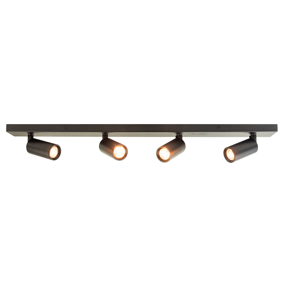 Deze moderne plafondspot met vier verstelbare spots is ideaal voor ruimtes waar je flexibel en gericht licht nodig hebt. Het armatuur is uitgevoerd in strak mat zwart en heeft een langwerpige, minimalistische vorm. De cilindervormige spots zijn draaibaar en kantelbaar, zodat je het licht perfect kunt richten op specifieke punten in de ruimte.