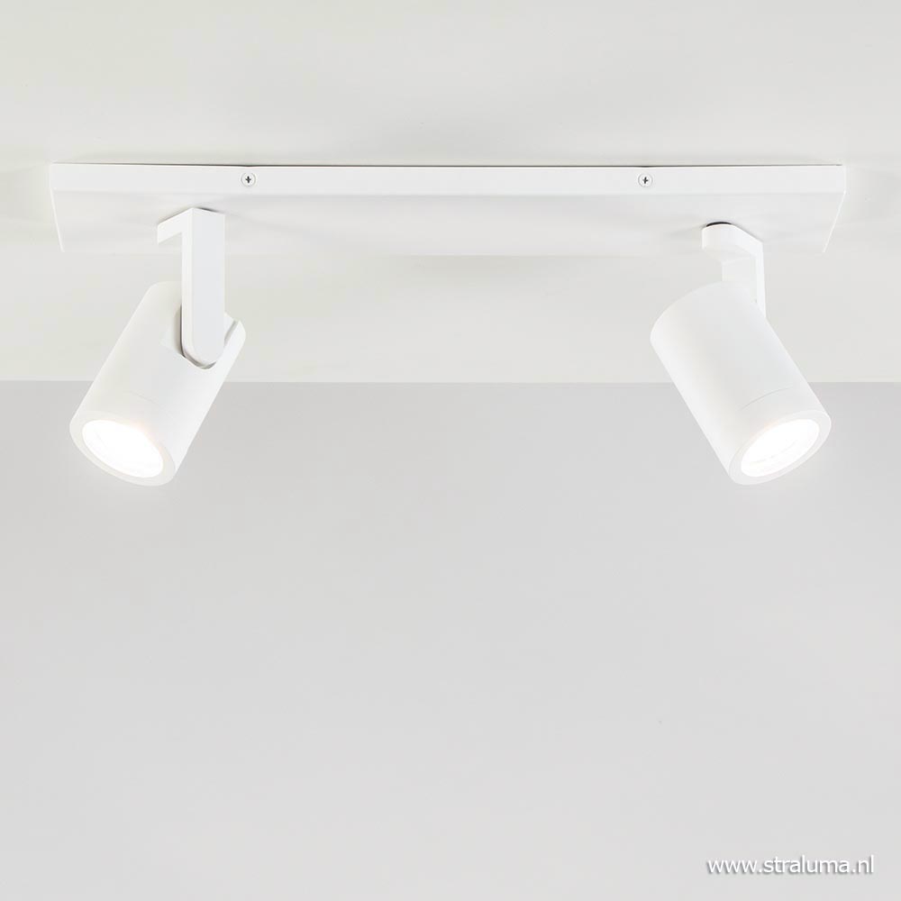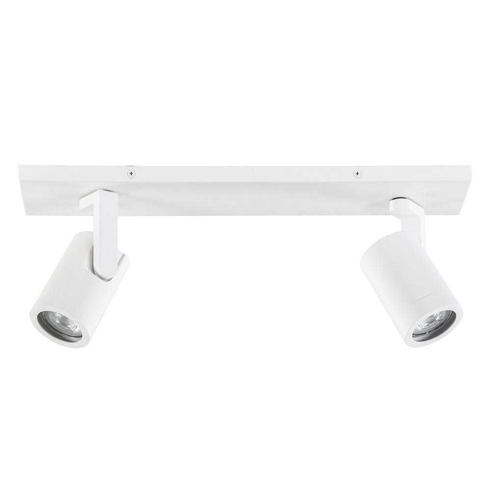 – hoogte: 15 cm – spots: Ø6×9 cm – bevestiging: 40×9,5×1,5 cm – metaal, mat wit – verstelbare spots – exclusief lichtbron (2x GU10) – dimbaar (exclusief)