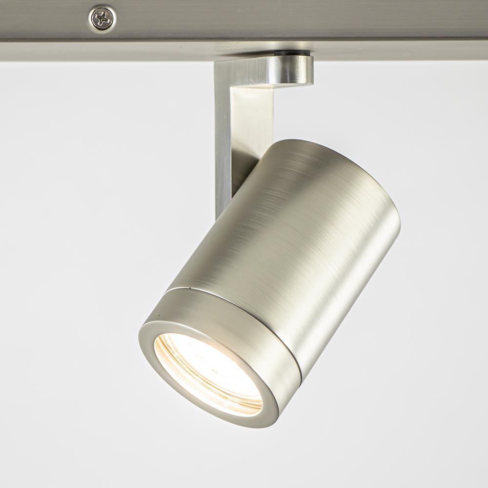 – hoogte: 15 cm – spots: Ø6×9 cm – bevestiging: 91,5×9,5×1,5 cm – metaal, mat nikkel – verstelbare spots – exclusief lichtbron (4x GU10) – dimbaar (exclusief)