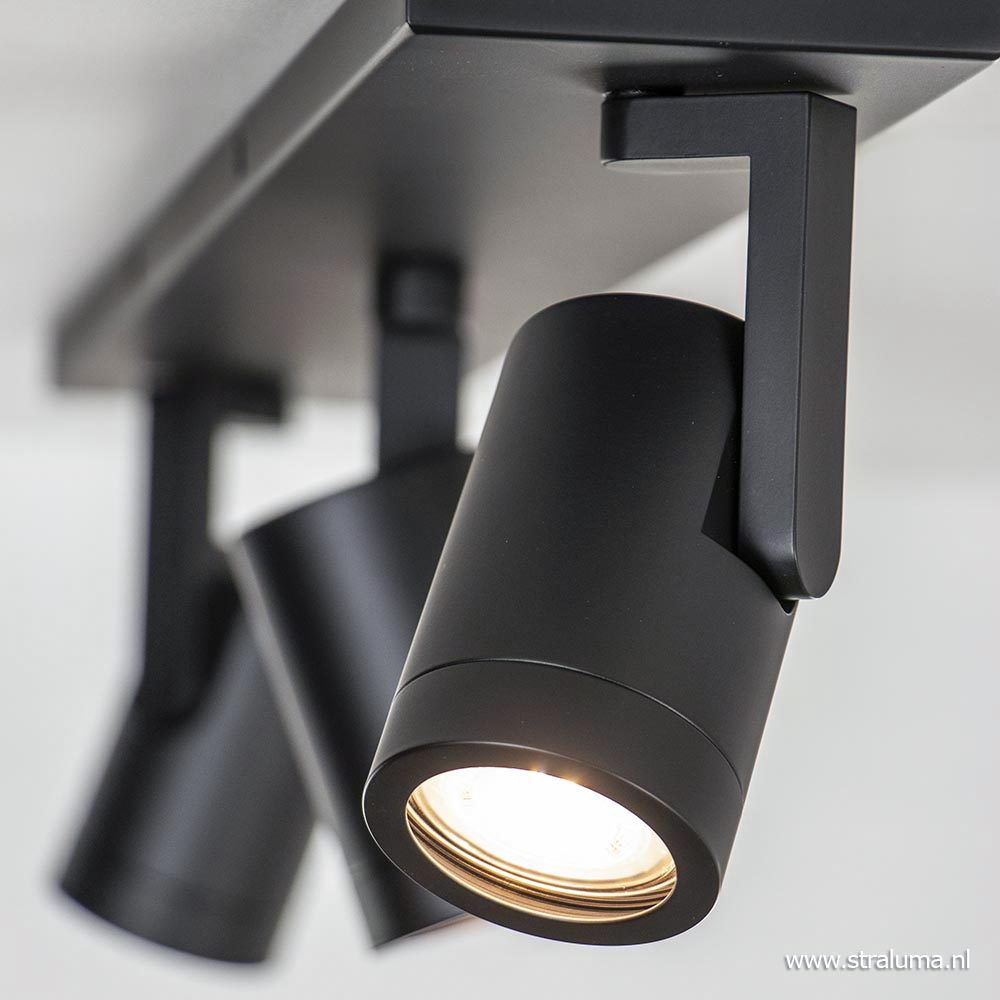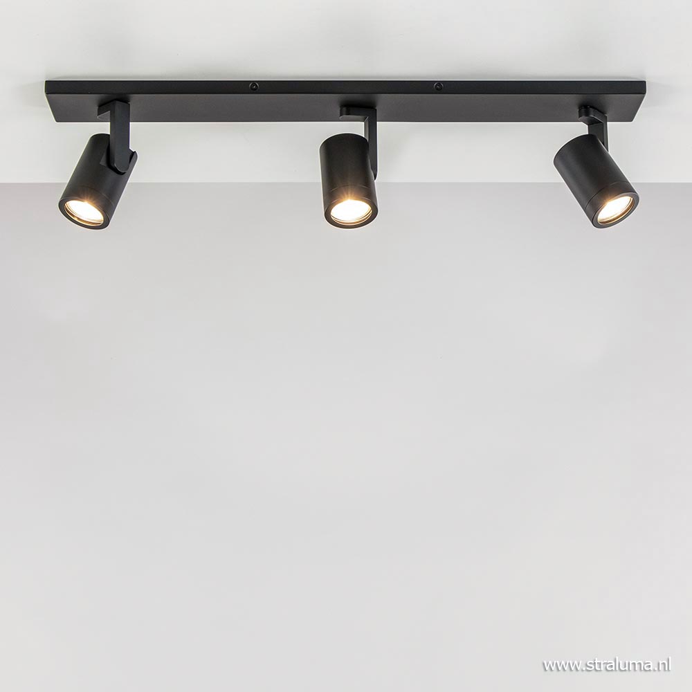 Deze moderne opbouwspot heeft een strak en minimalistisch design. De drie spots zijn gemakkelijk te verstellen door ze te draaien en te kantelen. Ideaal voor in een hal of smalle kamer. De spots zijn voorzien van een ring die eraf gedraaid kan worden zodat u de lichtbron kunt plaatsen. De metalen spots zijn bevestigd op een L-vormig pootje die weer is bevestigd op de metalen plafondbalk. De opbouwspot is volledig afgewerkt in mat zwart wat een luxe design look geeft. De 3-lichts plafondspot wordt geleverd zonder lichtbronnen (3x GU10).