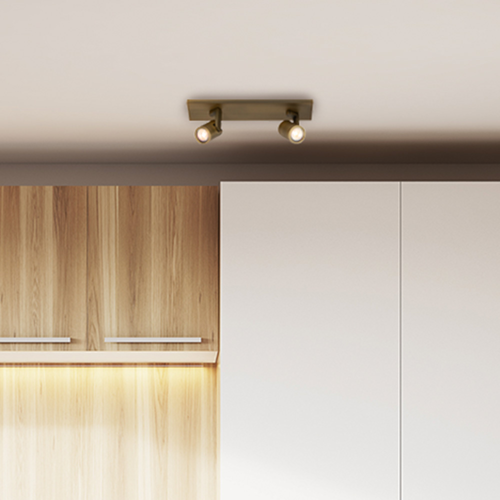Geef je interieur een stijlvolle upgrade met deze elegante 2-lichts plafondspot in oud brons. De spotjes zijn individueel richtbaar, waardoor je eenvoudig accenten legt op specifieke plekken in huis, ideaal voor in de keuken, hal, woonkamer of werkkamer. Het armatuur heeft een klassieke uitstraling door de warme messingkleur met geborstelde afwerking, maar past dankzij het minimalistische ontwerp ook perfect in moderne en industriële interieurs.