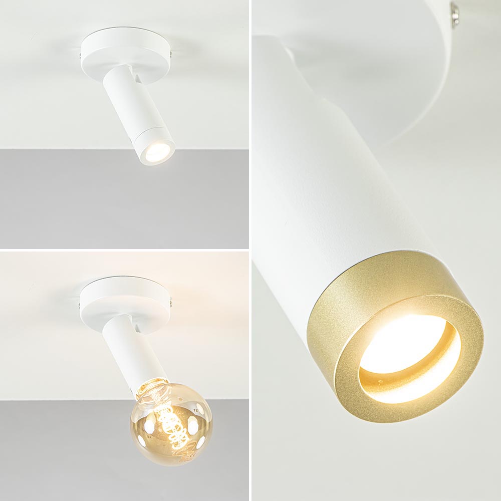 Een mooie plafondspot die prima geschikt is voor diverse woonstijlen. De enkele opbouwspot is gemaakt van mat wit metaal. De cilindervormige spot is verstelbaar door deze te draaien en/of te kantelen. Ideaal om net even die donkere hoek of dat schilderij uit te lichten. Ook voor het toilet is deze spot een ideale toevoeging. Het leuke aan deze spot is dat hij wordt geleverd met zowel een mat witte als een goudkleurige fitting ring. U kunt er zelfs voor kiezen de fitting ring weg te laten en de spot af te maken met een grotere lichtbron. Zo kiest u zelf welke look u wilt.