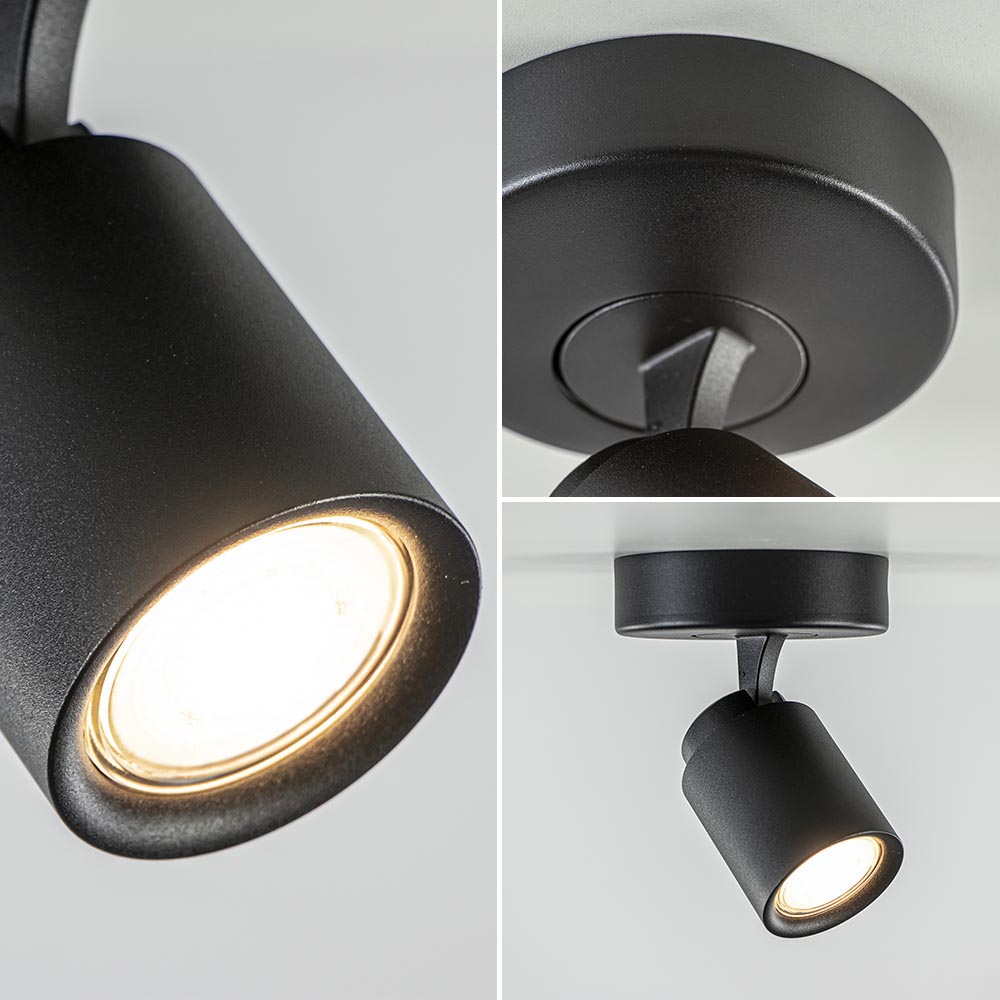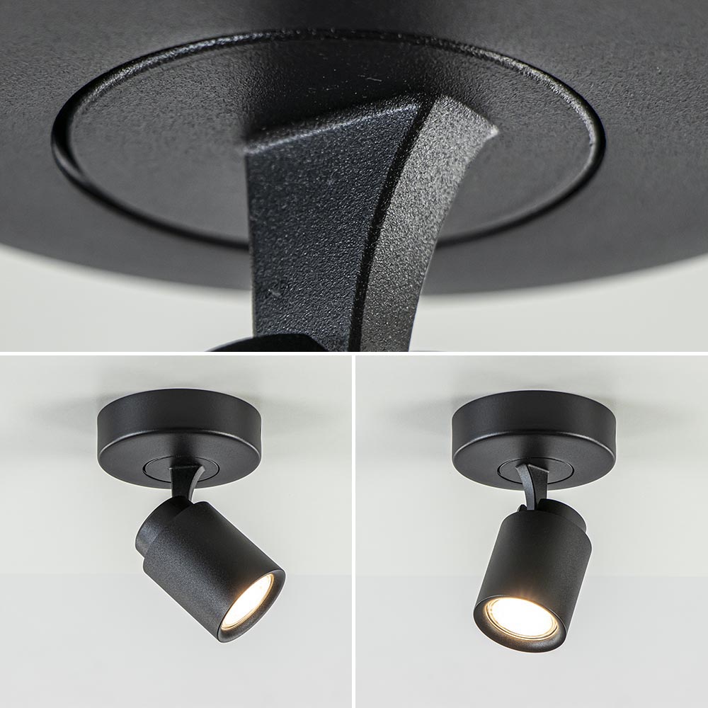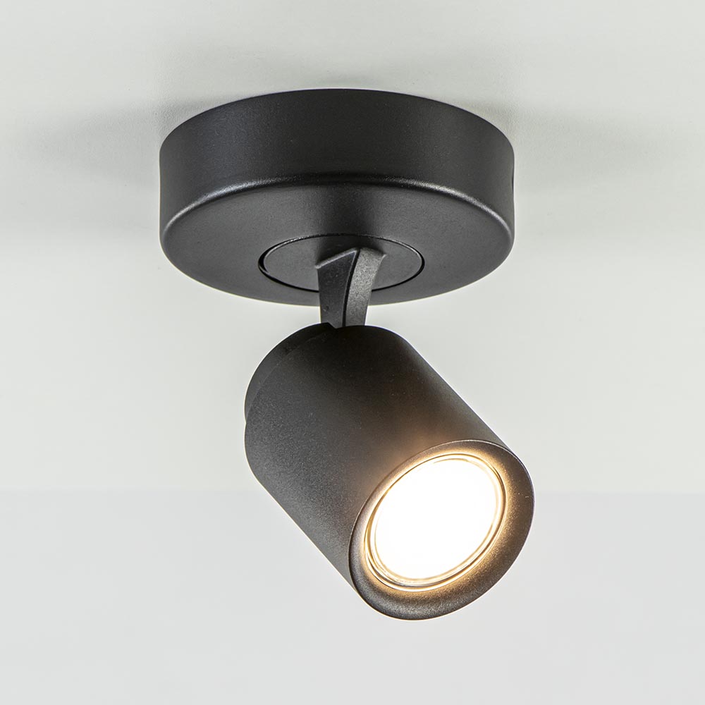 Op zoek naar een elegante zwarte plafond- of wandlamp? Dan is deze zwarte enkellichts opbouwspot rond echt iets voor u! De mat zwarte kleur zorgt voor zowel een chique als stoere toevoeging aan uw interieur. De zwarte 1-lichts spot is multifunctioneel te gebruiken, doordat de zwarte spot in richting versteld kan worden. De kap kan gekanteld en gedraaid worden, ideaal zodat u de spot naar elke gewenste richting kunt plaatse. De zwarte opbouwspot kan als plafondlamp of als wandlamp gebruikt kan worden. De lichtbron kan geplaatst worden door de kap volledig los te draaien.