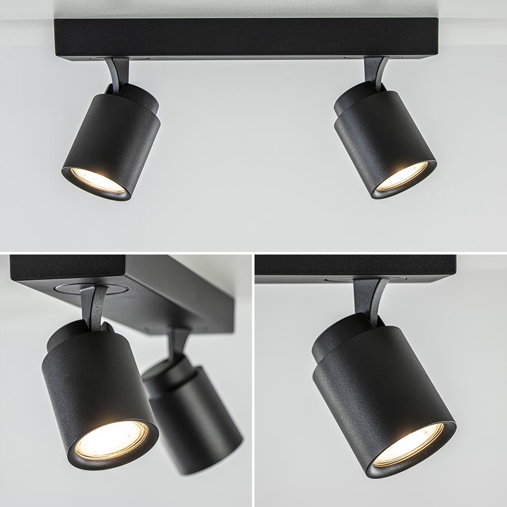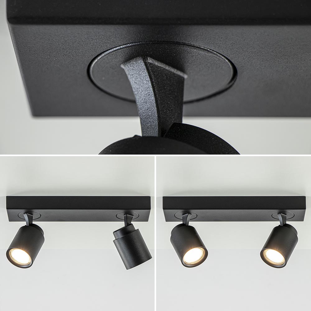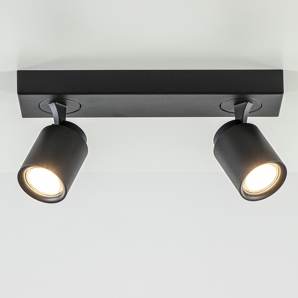 Ideaal voor in de hal of slaapkamer. Deze opbouwspot is gemakkelijk toe te passen in diverse woonstijlen. De 2-lichts plafondlamp is gemaakt van metaal en uitgevoerd in het mat zwart. De twee spotjes zijn gemakkelijk te verstellen door deze te draaien of te kantelen. Zo kunt u gemakkelijk de juiste richting bepalen en zo een donkere hoek of object uitlichten. De mat zwarte plafondspot wordt geleverd zonder lichtbron. De lichtbron kan worden geplaatst door de volledige kap van de spot los te draaien.