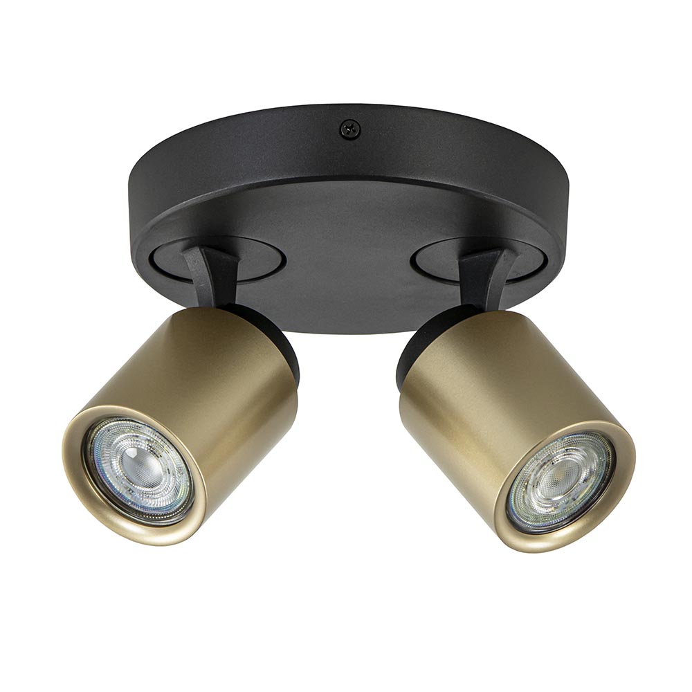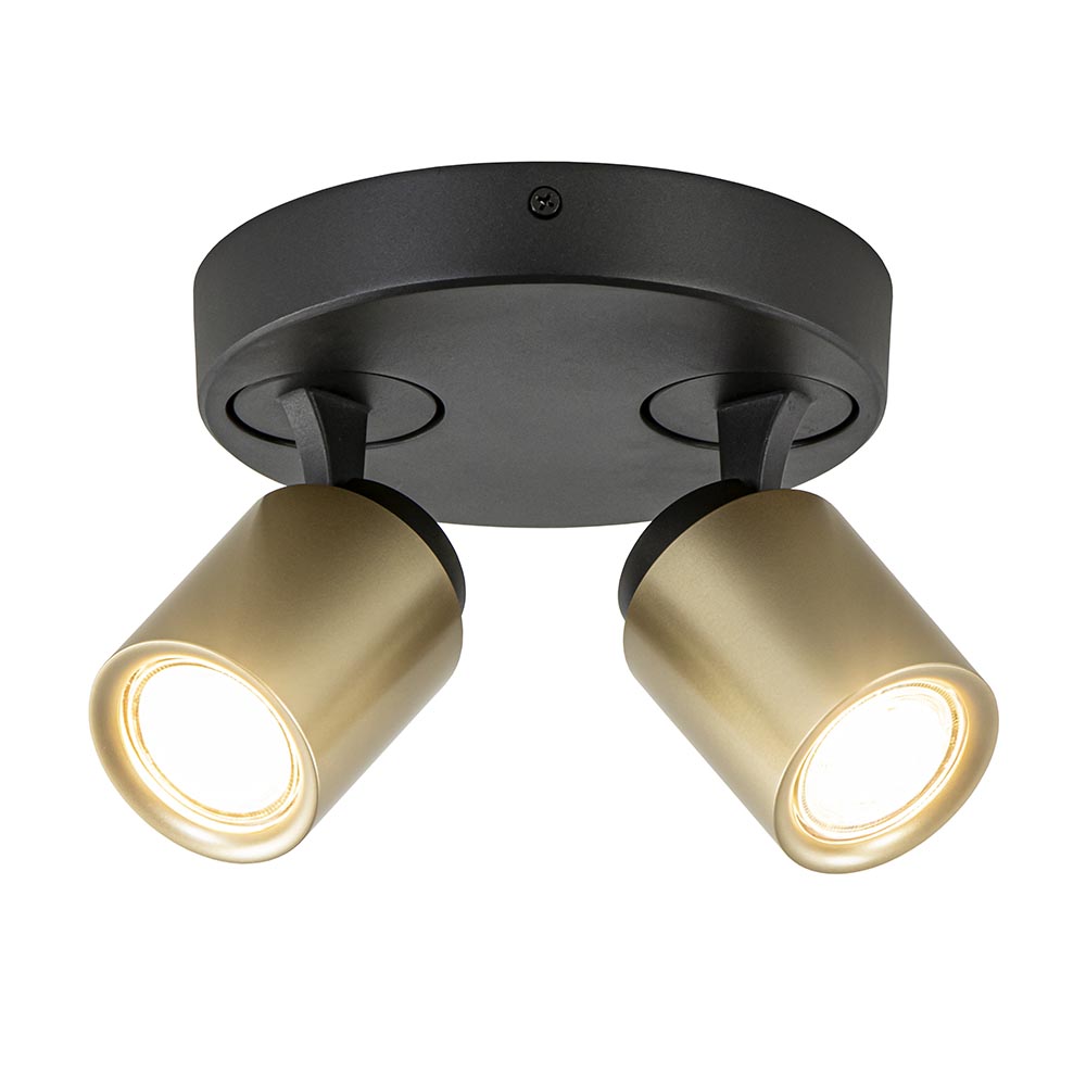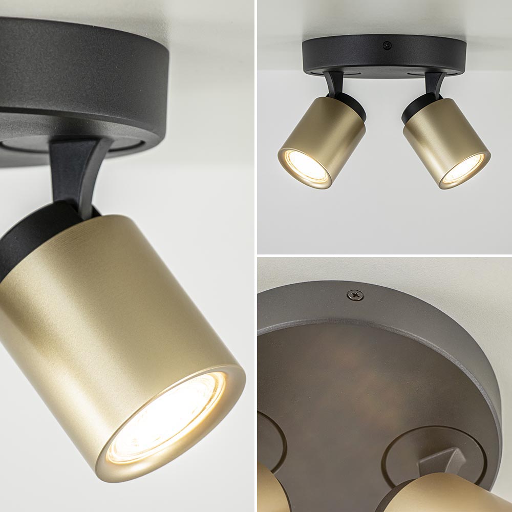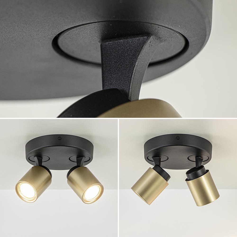 – hoogte: 16 cm – spots: Ø6,5×9 cm – bevestiging: Ø17×3 cm – metaal – zwart/goud – verstelbaar – exclusief lichtbron (2x GU10) – dimbaar (exclusief)