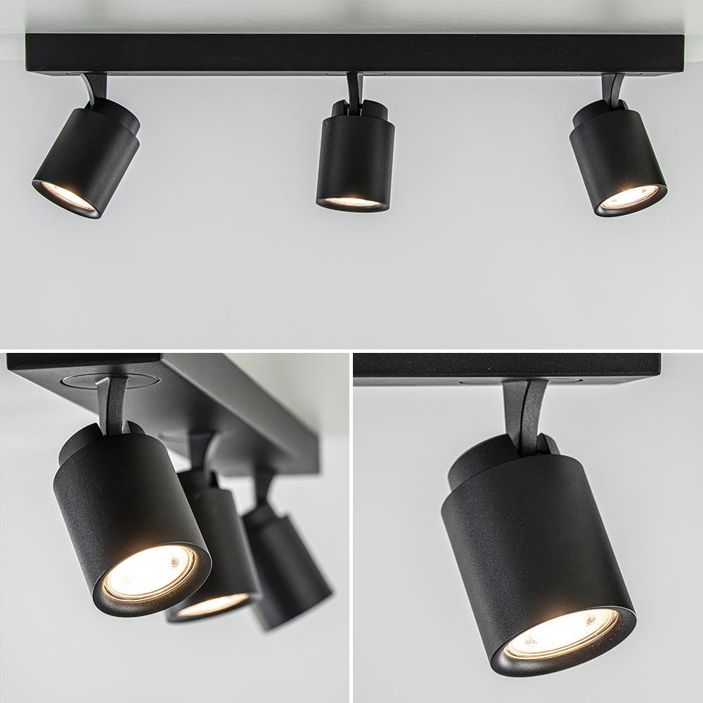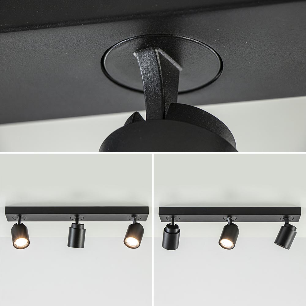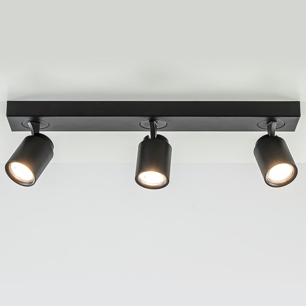 Ideaal voor in de hal of slaapkamer. Deze opbouwspot is gemakkelijk toe te passen in diverse woonstijlen. De 3-lichts plafondlamp is gemaakt van metaal en uitgevoerd in het mat zwart. De drie spotjes zijn gemakkelijk te verstellen door deze te draaien of te kantelen. Zo kunt u gemakkelijk de juiste richting bepalen en zo een donkere hoek of object uitlichten. De mat zwarte plafondspot wordt geleverd zonder lichtbron. De lichtbron kan worden geplaatst door de volledige kap van de spot los te draaien.