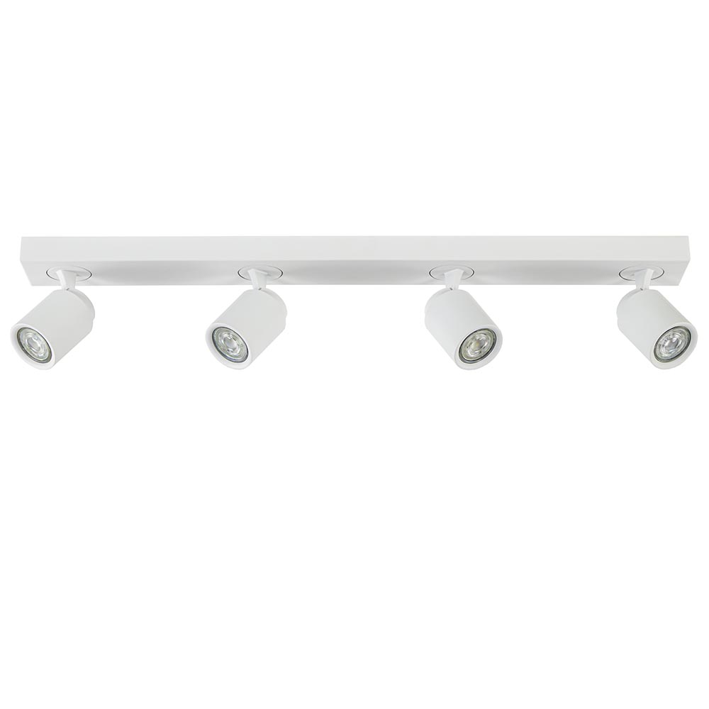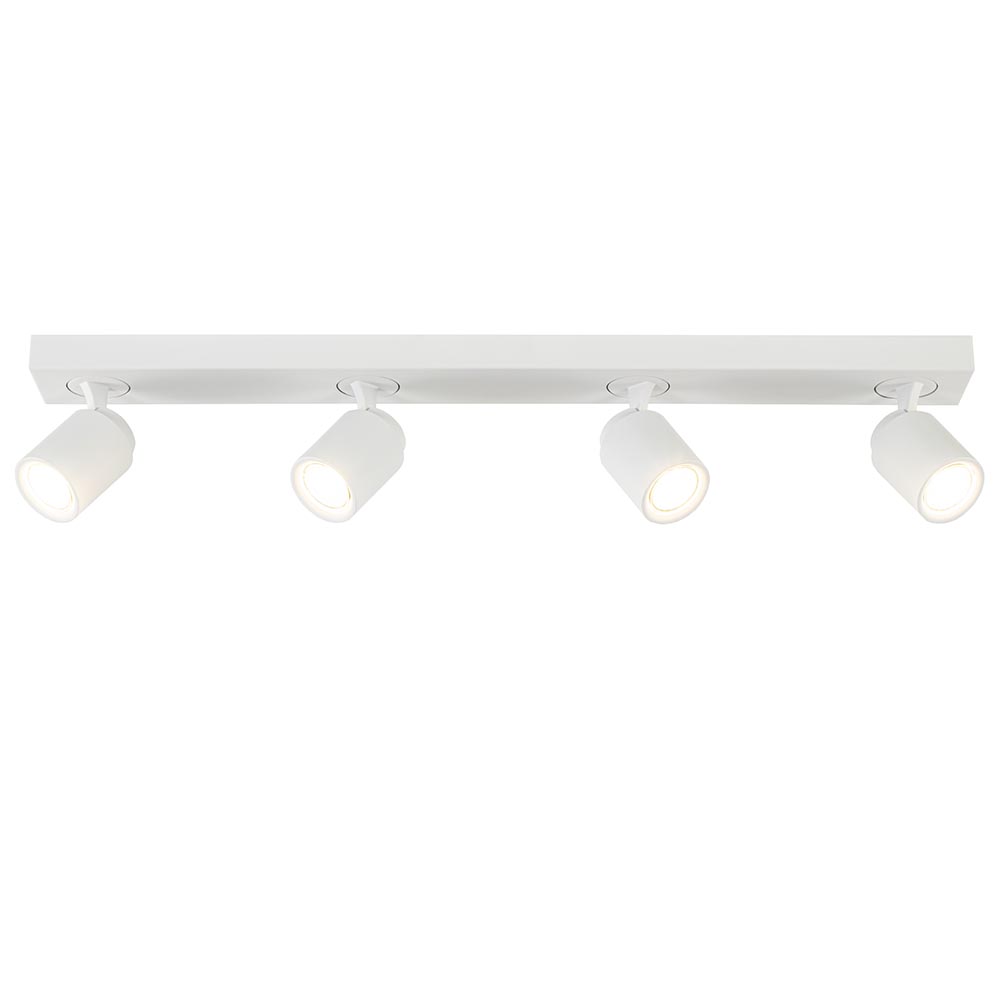 Ideaal voor in de lange hal of slaapkamer. Deze langwerpige opbouwspot is gemakkelijk toe te passen in diverse woonstijlen. De 4-lichts plafondlamp is gemaakt van metaal en uitgevoerd in het wit. De vier spotjes zijn gemakkelijk te verstellen door deze te draaien of te kantelen. Zo kunt u gemakkelijk de juiste richting bepalen en zo een donkere hoek of object uitlichten. De witte plafondspot wordt geleverd zonder lichtbron. De lichtbron kan worden geplaatst door de volledige kap van de spot los te draaien.