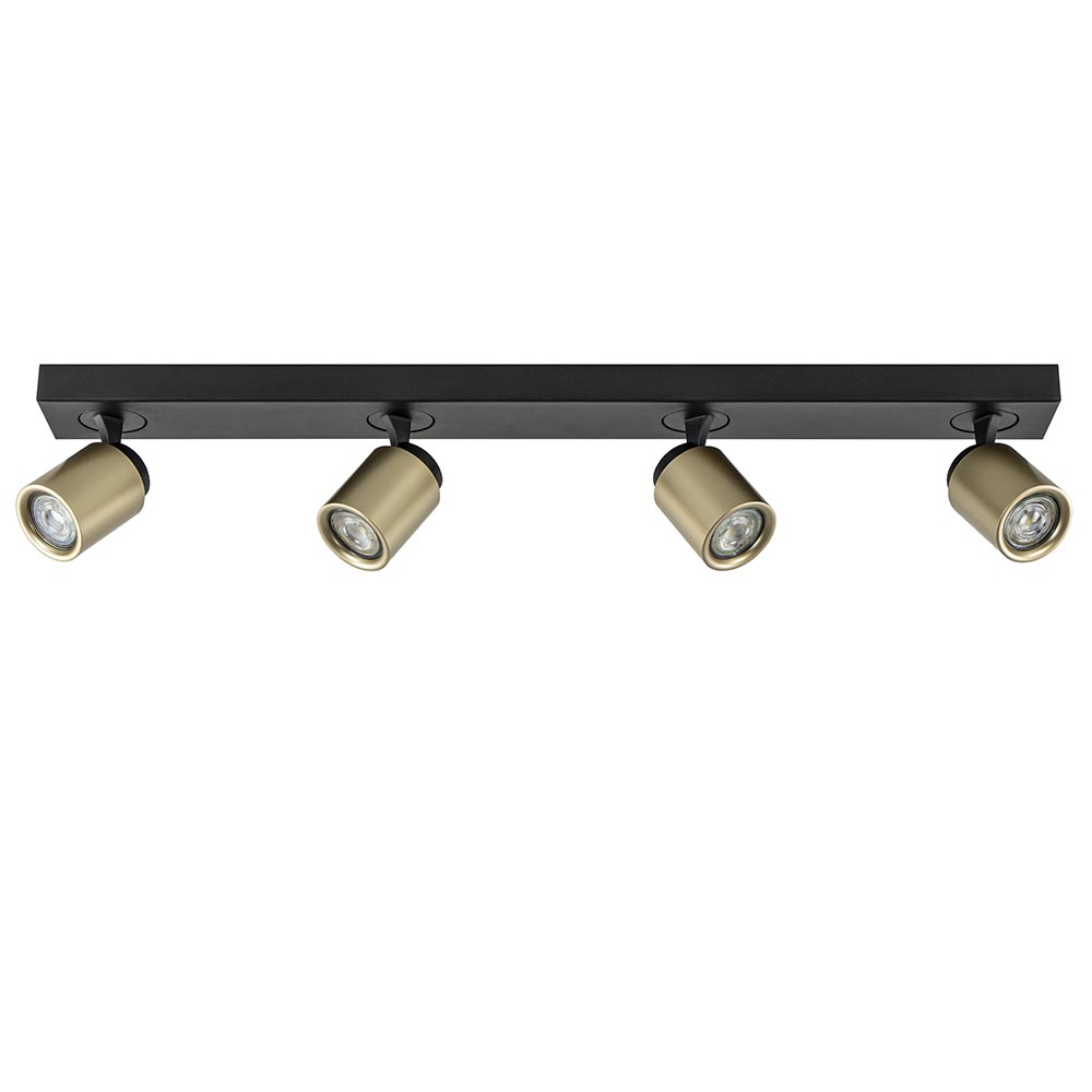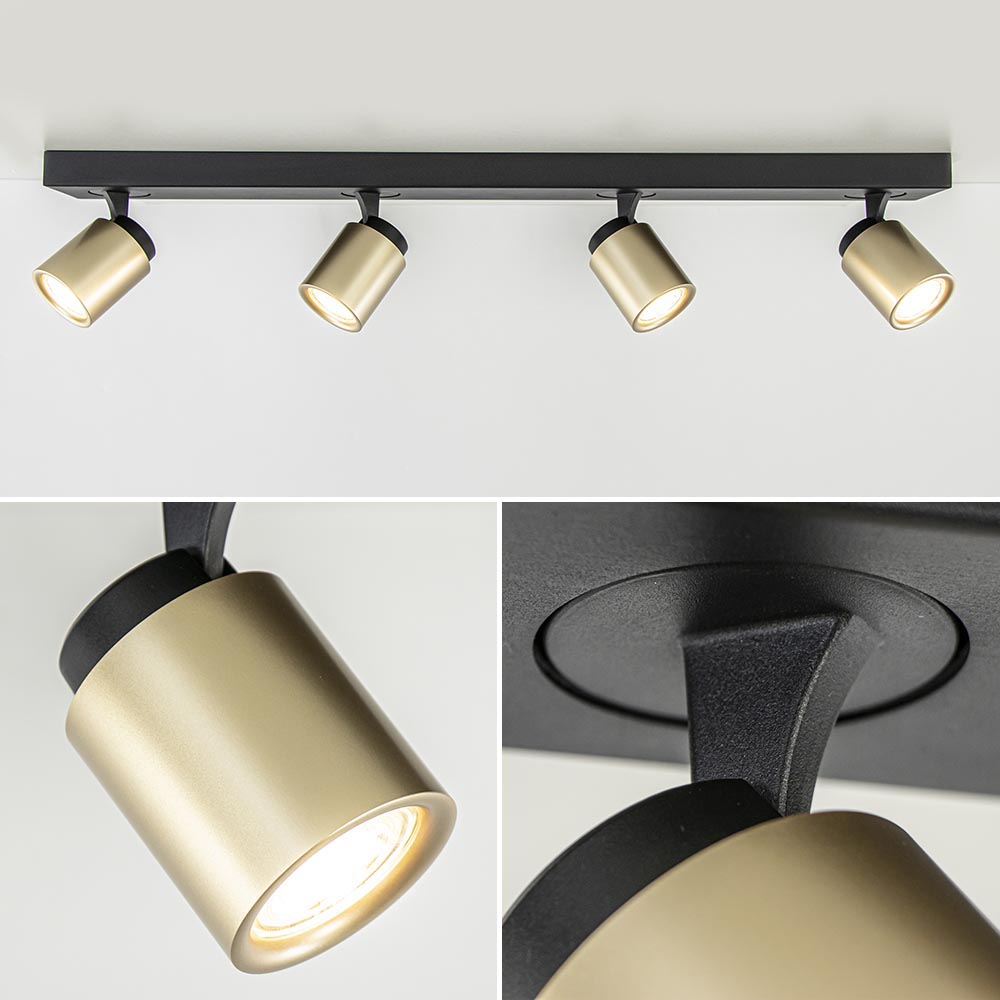 – hoogte: 16 cm – spots: Ø6,5×9 cm – bevestiging: 76x8x3 cm – metaal – zwart/goud – verstelbaar – exclusief lichtbron (4x GU10) – dimbaar (exclusief)