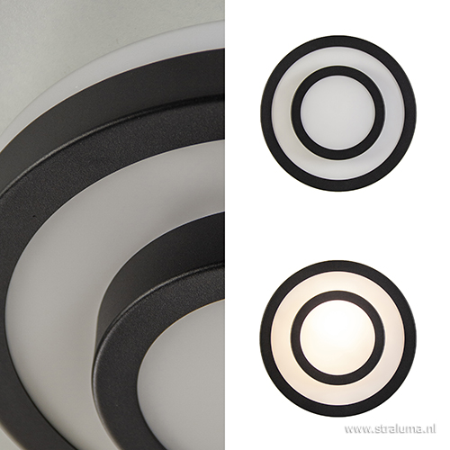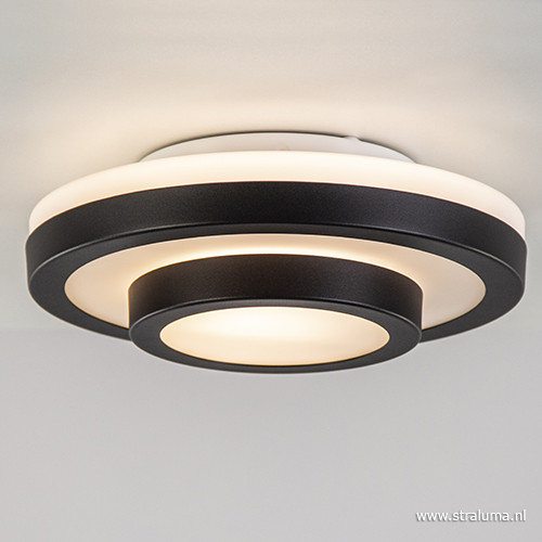 Het model van een klassieke plafonnière, maar dan in een modern jasje. Deze plafondlamp is voorzien van twee lagen waar opaal glas in zit verwerkt. Dit laat zachte en sfeervolle verlichting door. De kap draait gemakkelijk van de bevestiging af, zodat de lamp kan worden aangesloten en de lichtbron kan worden geplaatst. De mat zwarte plafondlamp is conform IP44, zodat deze perfect past in een badkamer. Daarnaast past de lamp vanwege z’n formaat ook mooi in een kleinere ruimte als een toilet, hal of overloop.