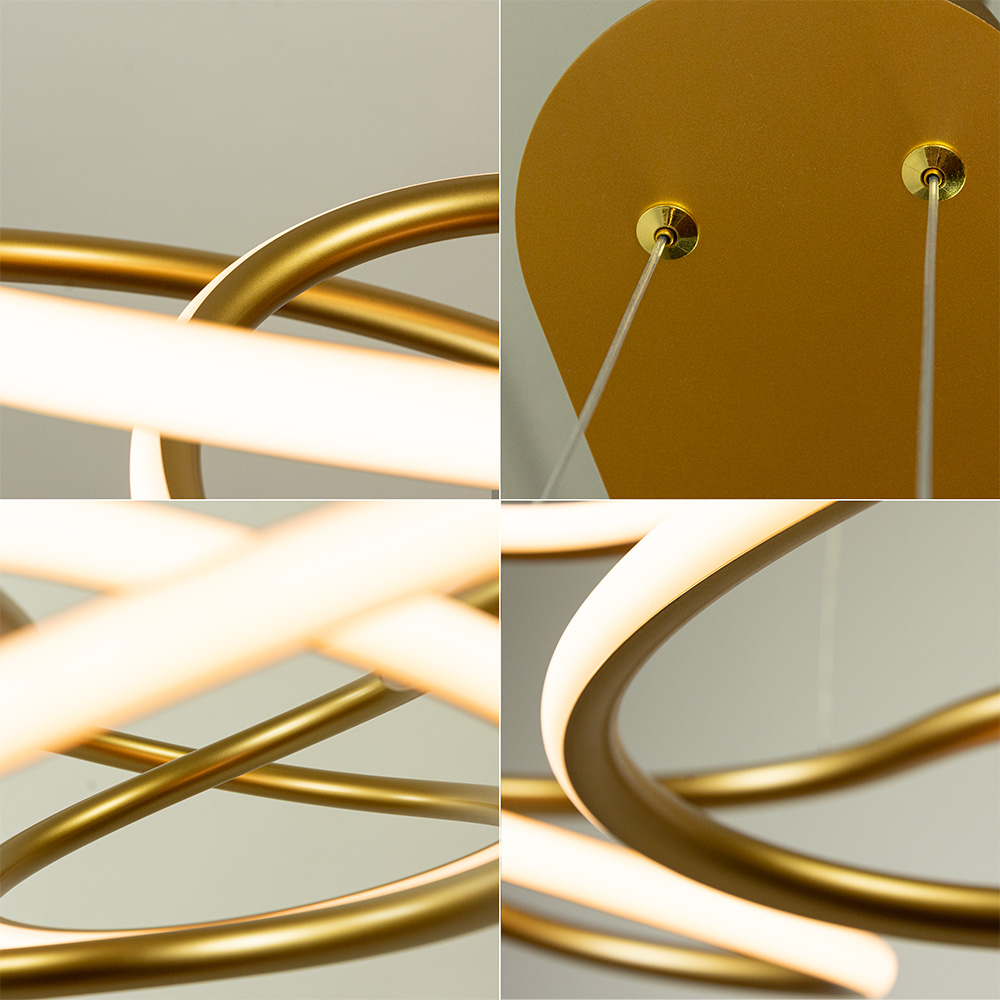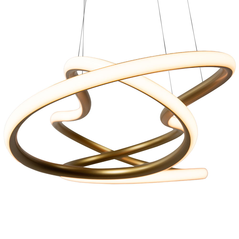 Deze sculpturale blikvanger met moderne flair laat je eet of woonkamer schitteren. De opvallende designlamp combineert kunstzinnige vormen met functioneel licht. De golvende lijnen van de geïntegreerde LED-verlichting vormen een elegant, zwevend sculptuur dat zowel overdag als ’s avonds indruk maakt. De warm witte LED-strip is subtiel verwerkt in de goudkleurige armaturen, wat zorgt voor een zachte, sfeervolle lichtverspreiding zonder verblinding. De lamp is tot max 120 cm in hoogte te verstellen waardoor hij zich moeiteloos aan past aan diverse plafondsituaties, ideaal boven een eettafel of kookeiland.