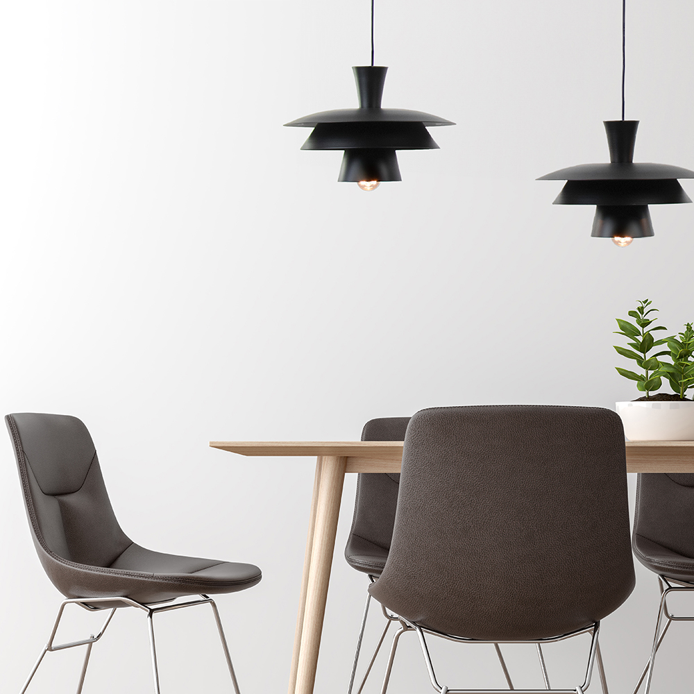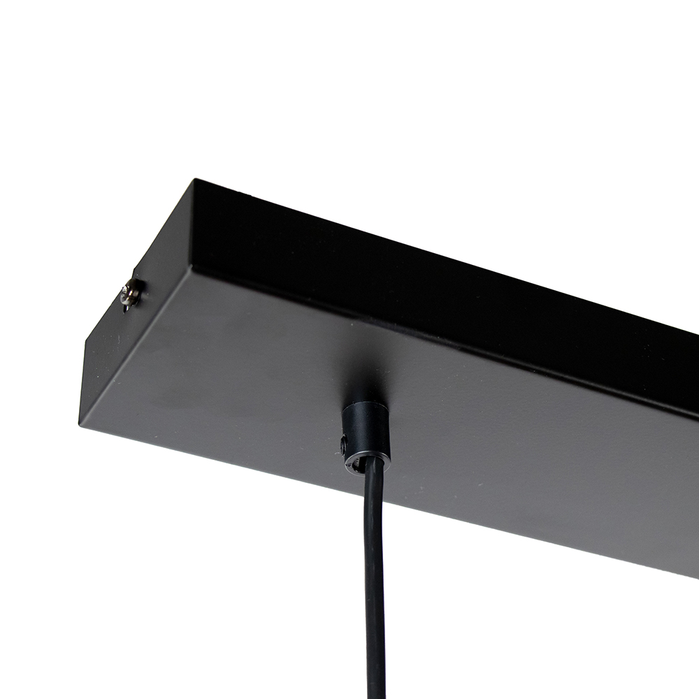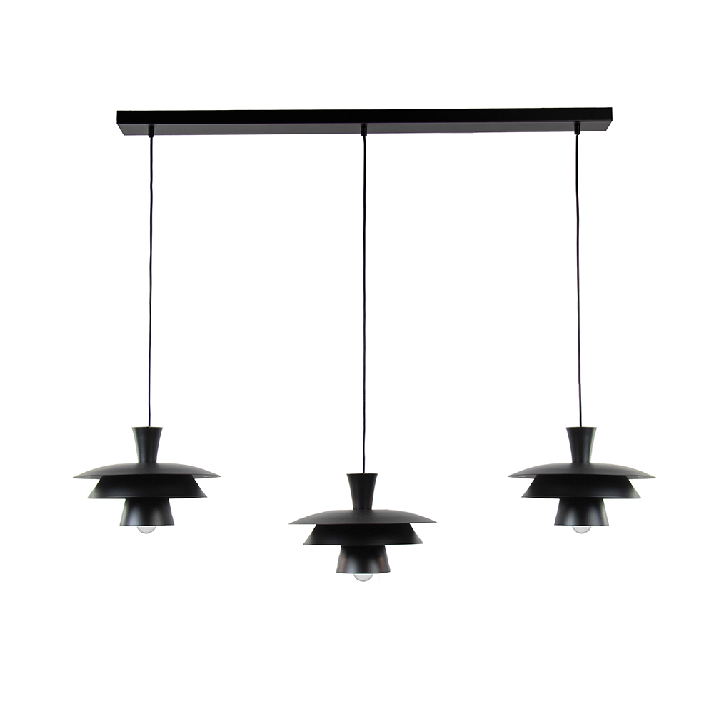 Een uitstekende hanglamp voor boven de eettafel. De lange plafondbevestiging met de 3 kappen geven nog meer lengte aan de eettafel. De hanglamp is uitgevoerd in een mat zwarte kleur en past mooi in een Industriële of landelijke woonstijl. Doormiddel van het snoer kunt u deze hanglamp eenvoudig in lengte verstellen.