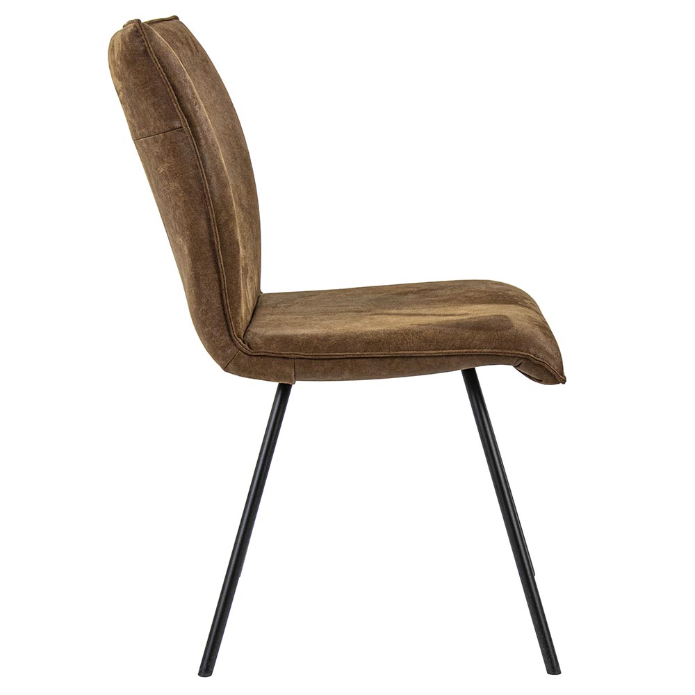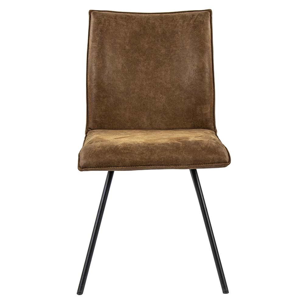 Een landelijke eetkamerstoel met een modern trendy afwerking. De eettafelstoel heeft een dikke zitting die zorgt voor een fijn zitcomfort. Ideaal tijdens het lange tafelen en natafelen. De zitting loopt mooi door in de rugleuning en is volledig gemaakt van PU leder in een mooie camel kleur. De zitting is afgewerkt met opstaand randje. De stoel wordt ondersteund door vier smalle gepoedercoate metalen pootjes in het mat zwart die de landelijke stoel een wat moderne touch geven.