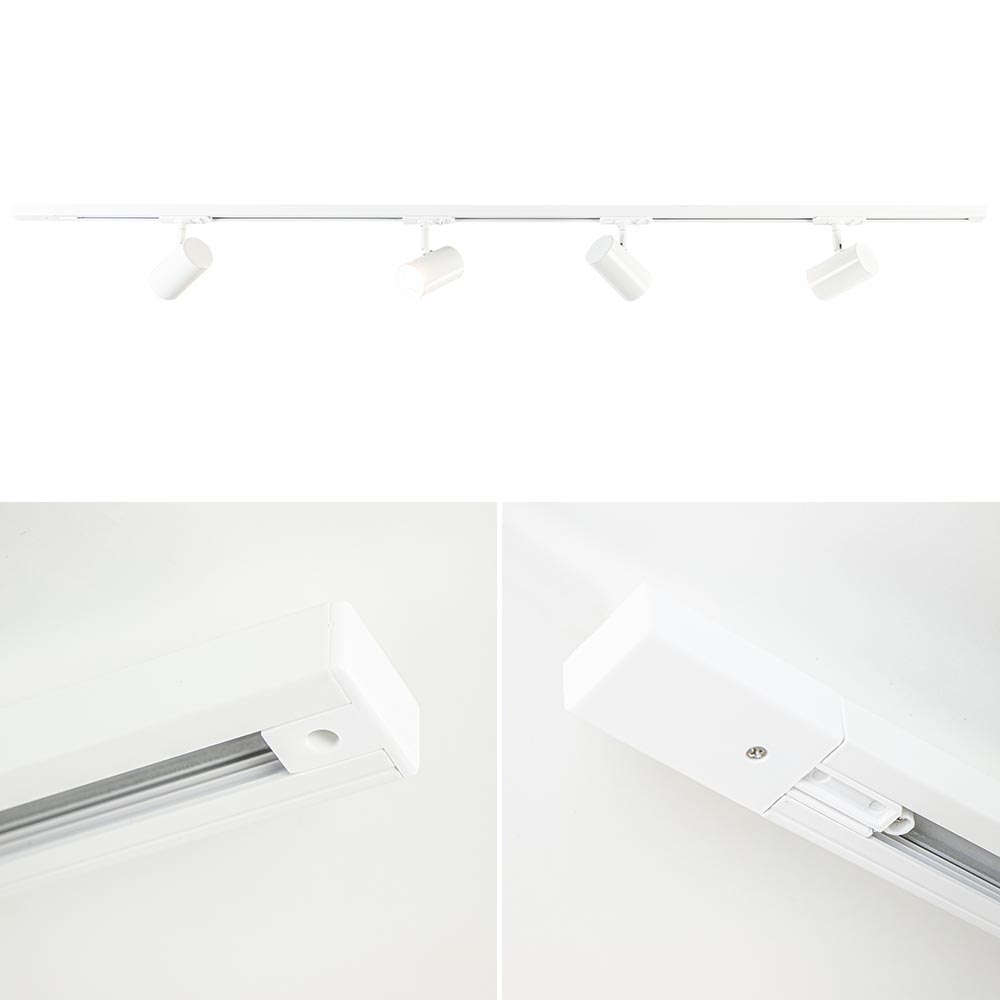 Ideaal om een ruimte extra uit te lichten of meer sfeer aan te brengen. Dit 1-fase railsysteem wordt geleverd inclusief 4 spots, beide uitgevoerd in het wit. De rail heeft een lengte van 150 cm waar de spots gemakkelijk op kunnen worden verdeeld. Druk de spot in de rail en zet hem vast door de knop om te zetten. De spots kunnen verder nog draaien en kantelen. Bepaal dus zelf hoe u het licht wilt verspreiden. Het railsysteem heeft 1-fase, dit houdt in dat alle lampen tegelijk zullen worden in- en uitgeschakeld. Handig voor in een lange hal of slaapkamer, maar ook in de keuken of woonkamer past dit systeem perfect. De smalle rail en de cilindervormige spots geven een strak en modern geheel aan de ruimte. Het witte railsysteem is dimbaar met een externe dimmer.