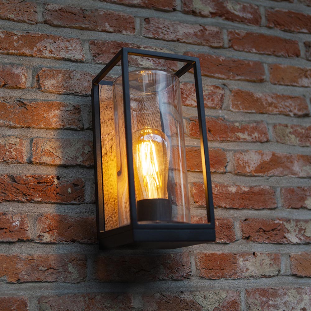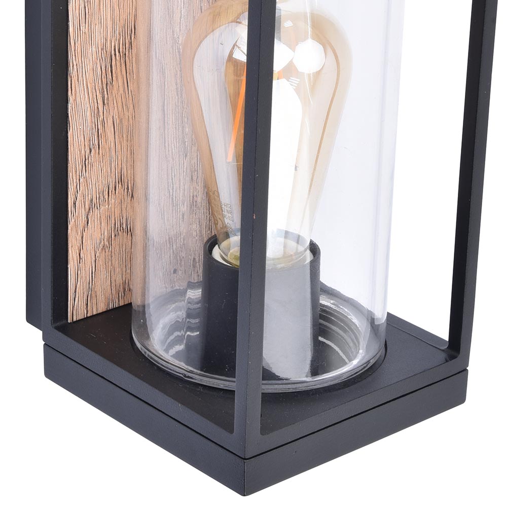 – afm: 12x14x26 cm – bevestiging: 11x2x24 cm – glas: Ø10×22 cm – aluminium – zwart – helder glas – houtlook – IP44 – weerbestendig van -20° tot +50°C – exclusief lichtbron (E27)