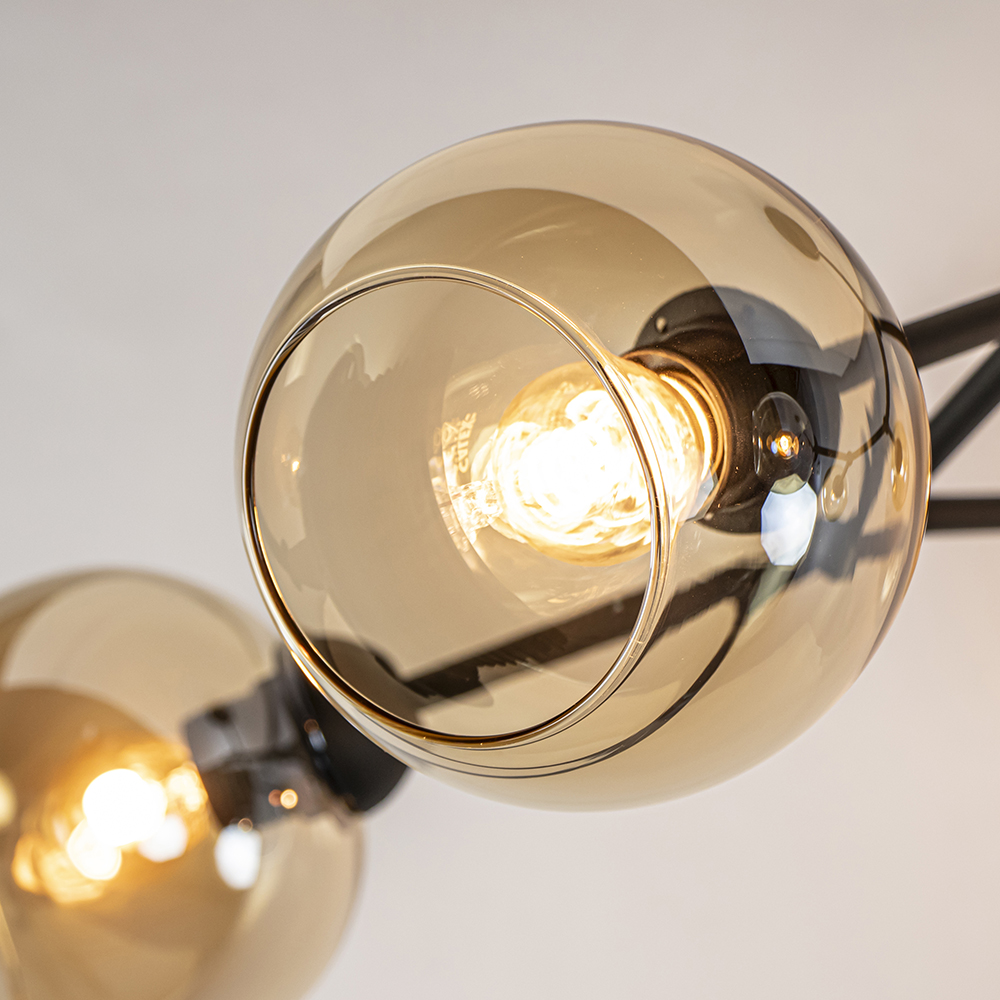 Grote speelse plafonniere helemaal van deze tijd. Het metalen armatuur is zwart gespoten en gecombineerd met gouden/amber glazen. Dit geeft deze plafondlamp een hele warme uitstraling. Liever geen hanglamp boven de eettafel dan is dit een hele goede vervanging. Door de verschillende armen gebeurt er echt wat tegen het plafond en is het echt een blikvanger. Natuurlijk geldt dit ook wanneer u deze plafondlamp in de slaapkamer hangt. Ook leverbaar met smoke glas.