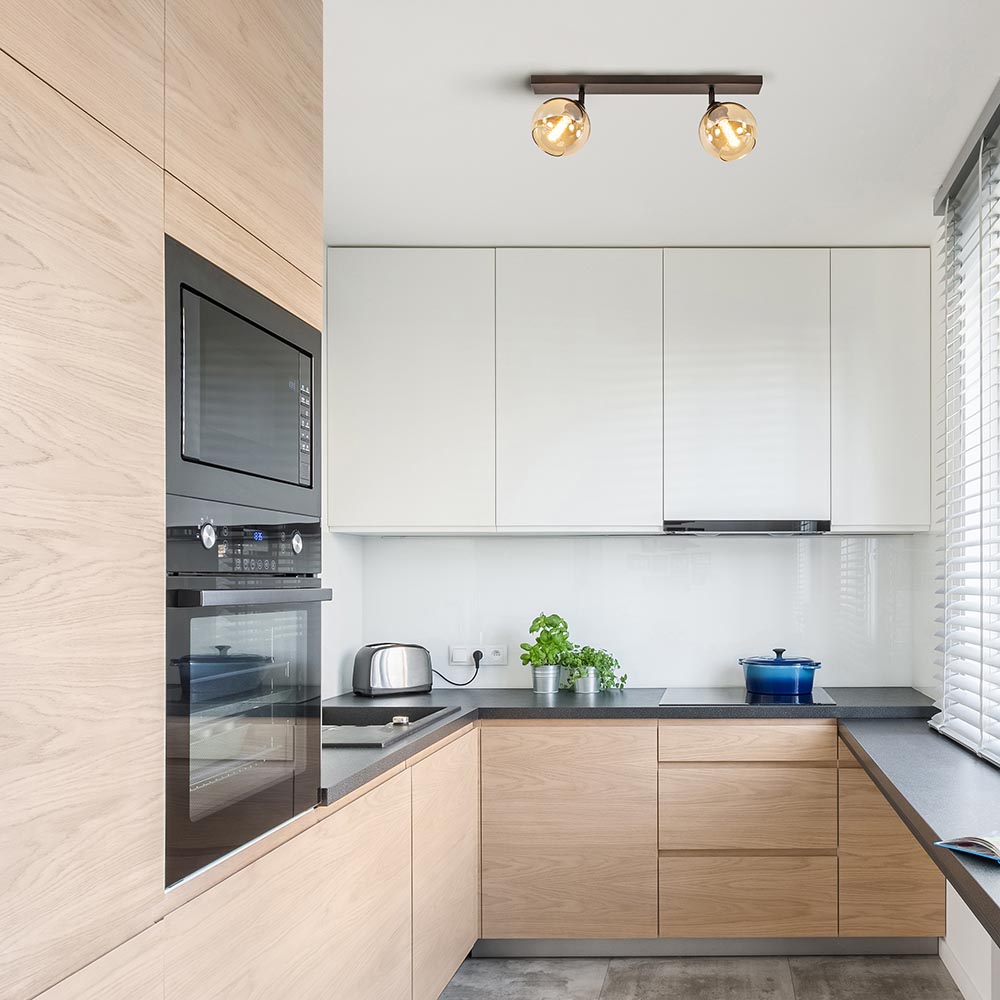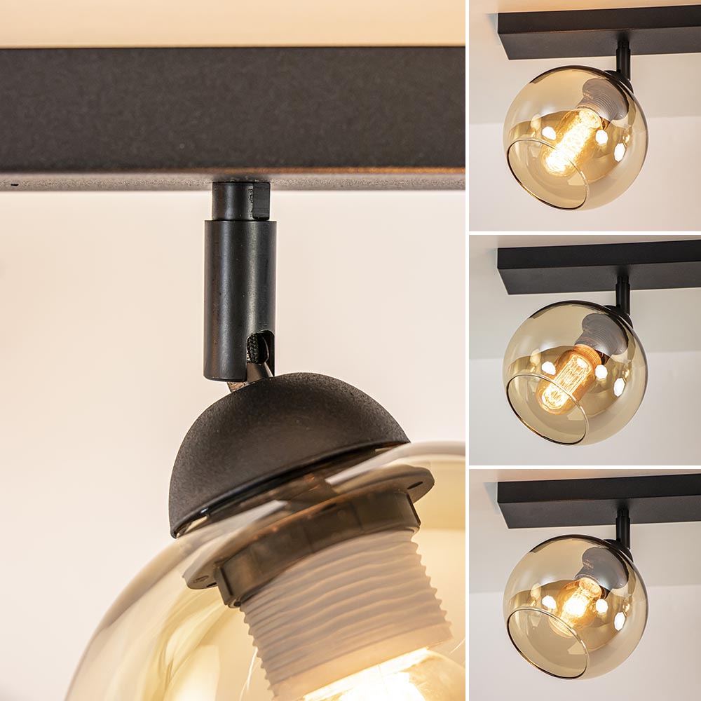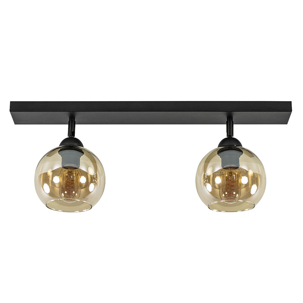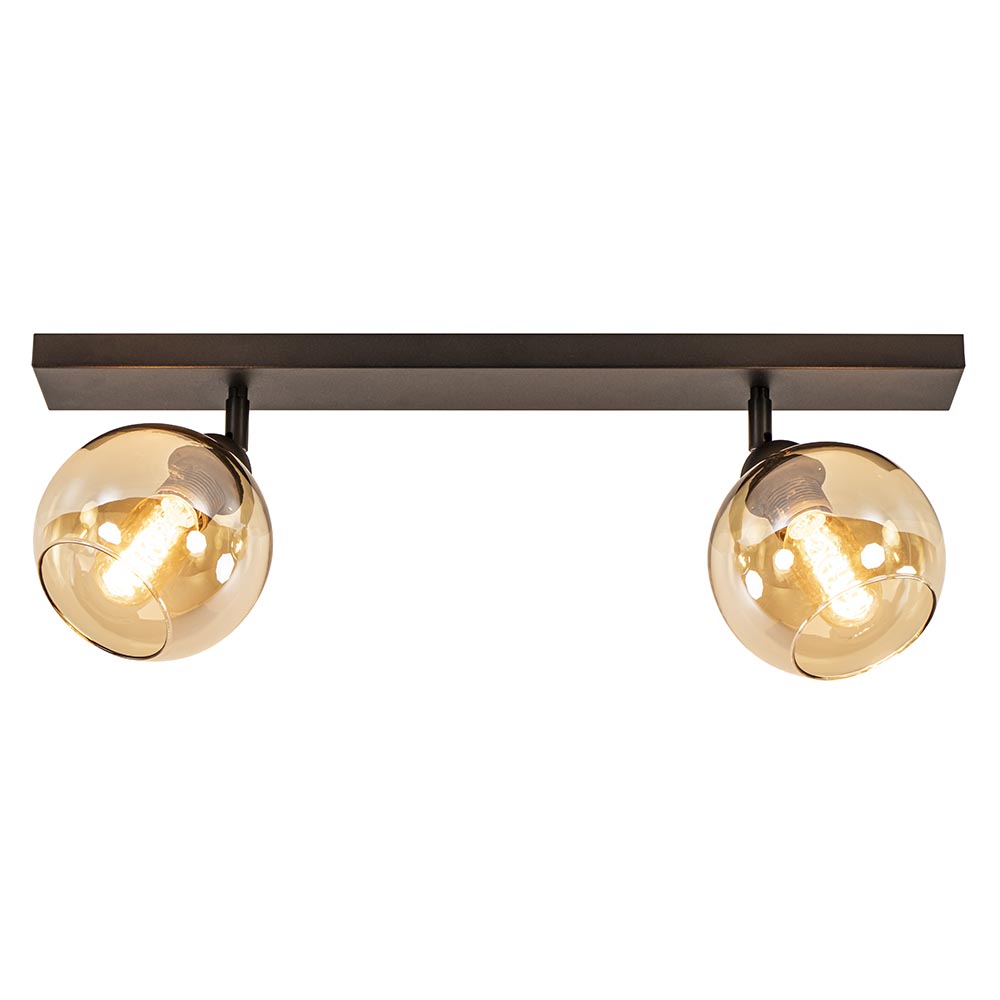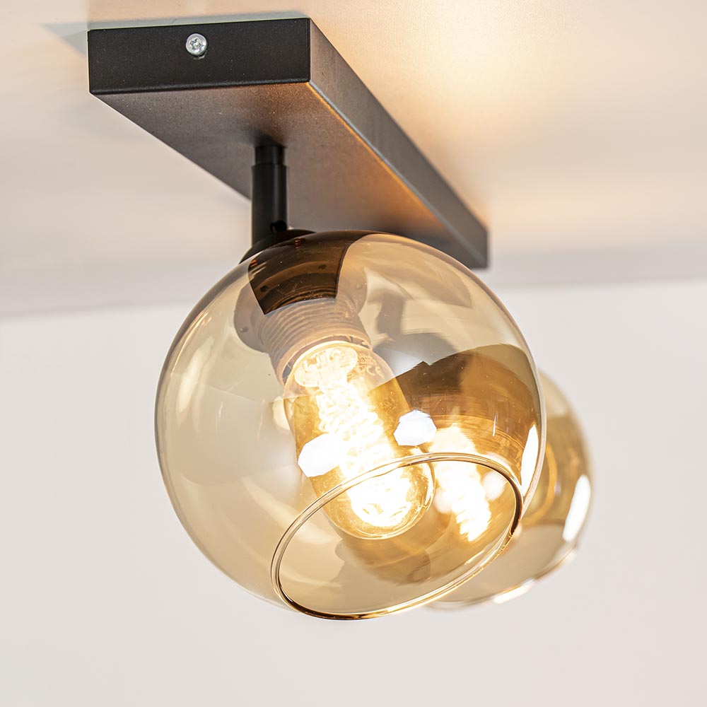 Mooie mat zwarte 2-lichts plafondlamp met amber glas. De fittingen zijn 350 graden te draaien waardoor u de lamp eigen kunt maken. Deze plafondlamp is een mooie aanvulling in een hal of woonkamer. De amber kleurige glazen bollen geven de plafondlamp een luxe warme uitstraling, perfect voor een klassiek of retro interieur. De 2-lichts plafondlamp wordt zonder lichtbronnen geleverd. De lamp is dimbaar met de juiste dimmer (exclusief).