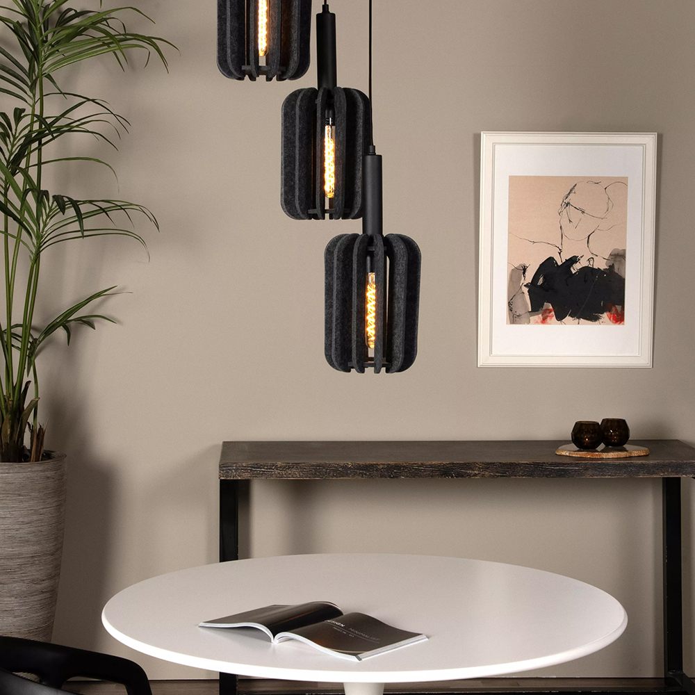 Deze sfeervolle hanglamp is een leuke blikvanger in het interieur. De pendellamp heeft een zwart metalen armatuur dat is gecombineerd met kappen van hoogwaardig grijs vilt. Het vilt zorgt voor een unieke look en een prachtig schouwspel aan licht en schaduw in de ruimte. De kappen zijn naar wens op hoogte te hangen met een maximale hoogte van 183 cm. Ideaal voor boven een ronde eet- of salontafel. De ronde 3-lichts hanglamp is dimbaar middels een externe dimmer (exclusief) en wordt geleverd exclusief lichtbronnen.