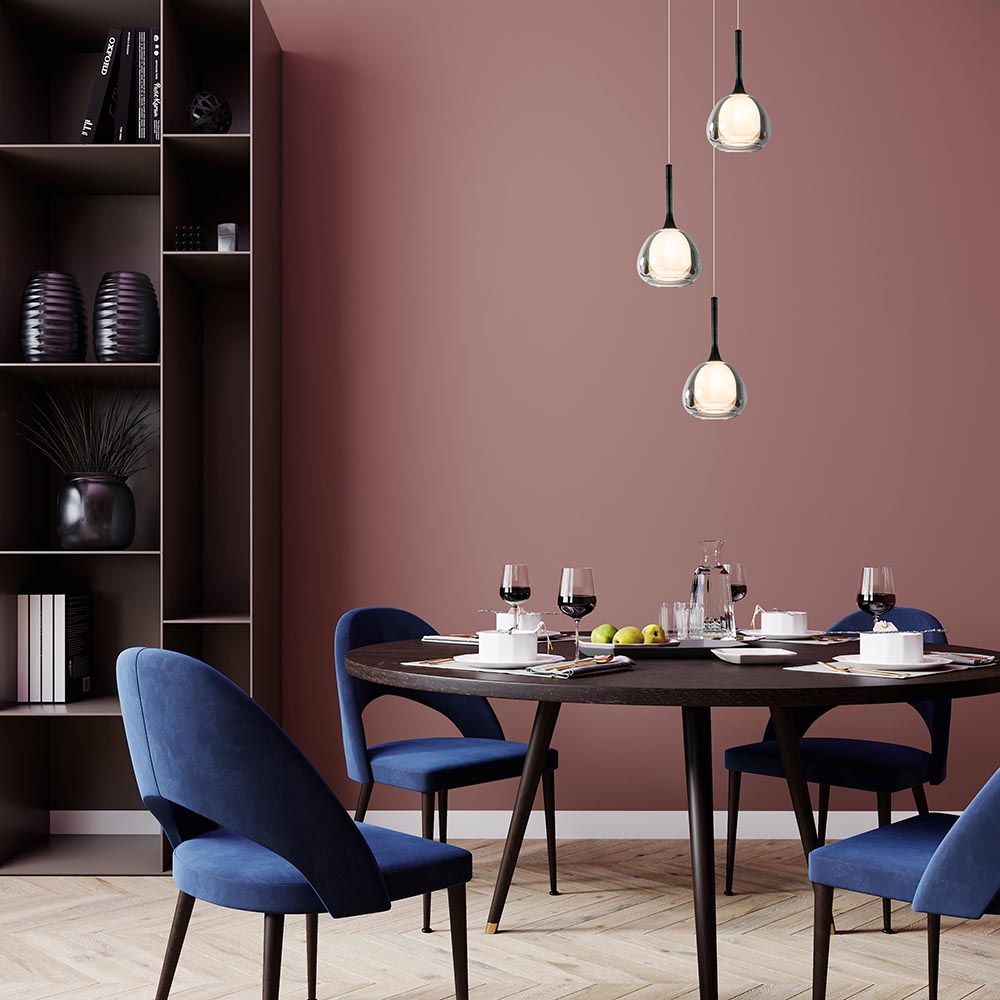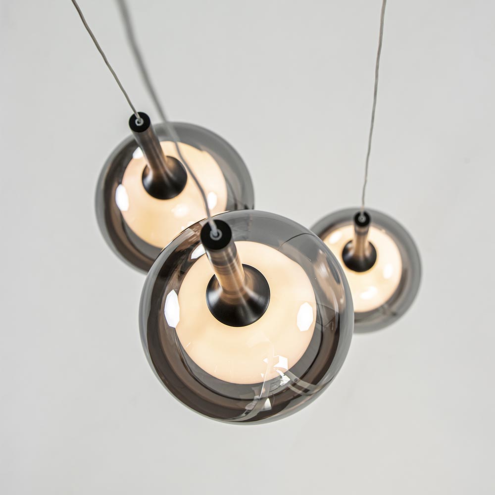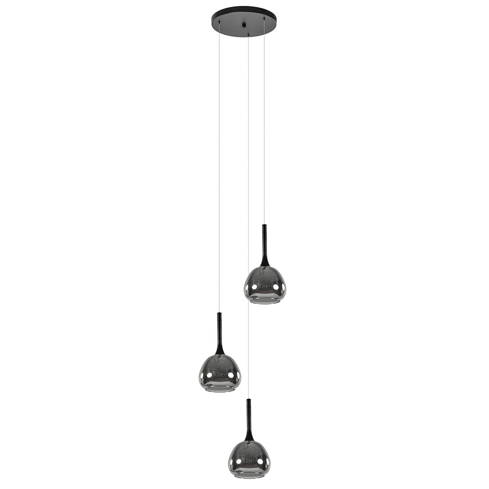 Deze ronde 3-lichts hanglamp is een mooie toevoeging aan een ruimte met een hoog plafond, een open hal of boven een ronde eettafel. De moderne hanglamp is voorzien van 3 glazen kappen met een smoke buitenglas en een wit binnenglas. De smoke glazen kappen zorgen met hun titanium look voor een mooi spiegelend effect wanneer de lamp is uitgeschakeld. Schakelt u de lamp in, dan komt het witte binnenglas tevoorschijn die zorgt dat het licht mooi diffuus wordt verspreid. Het mat witte binnenglas zorgt er tevens voor dat u niet direct in de lichtbron kijkt. Het smoke glas wordt donker transparant wanneer de lamp is ingeschakeld en zorgt zo voor een luxe uitstraling. De ronde 3-lichts hanglamp wordt aan het plafond bevestigd met een zwarte ronde plafondplaat en is gemakkelijk in hoogte te verstellen. Het zwart in combinatie met het glas zorgt dat de hanglamp in diverse woonstijlen te combineren is.