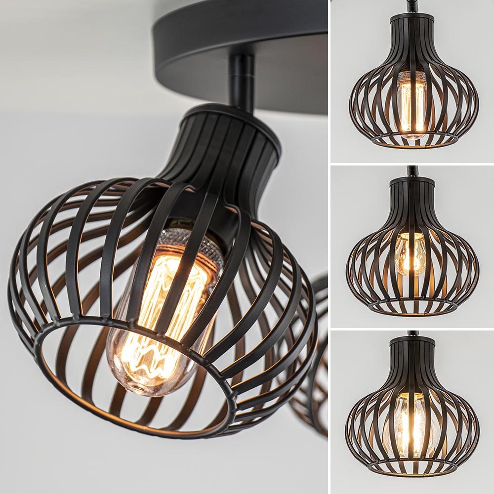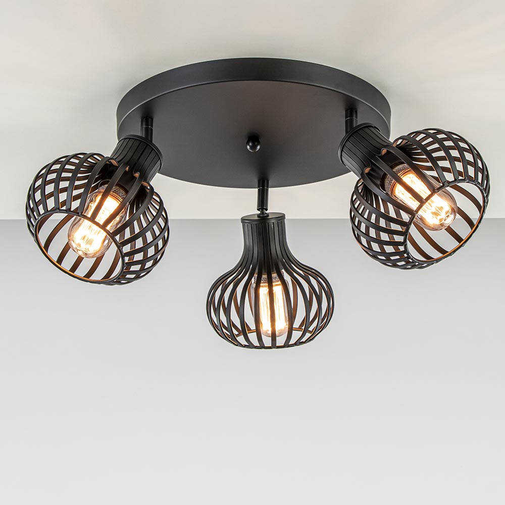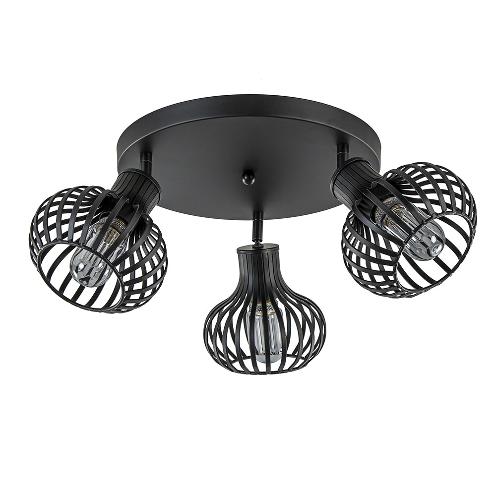 Perfect voor in de woonkamer, slaapkamer of hal. Deze ronde 3-lichts plafondlamp is volledig gemaakt van metaal en afgewerkt met een mat zwarte finish. Het matte zwart zorgt dat de lamp perfect past in een Scandinavisch of modern interieur. De plafondlamp is voorzien van drie draadkapjes in de vorm van een ui. De kapjes hebben wat bredere speilen die de moderne uitstraling versterkt. De ronde kapjes zijn los van elkaar te verstellen door deze te draaien en te kantelen. De kapjes van deze Scandinavische plafondlamp zijn maar klein maar zorgen door de open structuur dat er genoeg licht kan worden verspreid. De lichtbronnen zijn exclusief (3x E27).