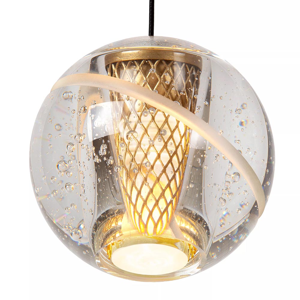 Breng de sfeer in het interieur naar een hoger niveau met deze prachtige 5-lichts ronde hanglamp. De lamp wordt bevestigd met een ronde metalen plaat die is uitgevoerd in het goud. Over de plaat zijn 5 lichtpunten verdeeld die ieder naar wens op hoogte zijn te hangen. De maximale hoogte van de lamp is 150 cm. De kappen bestaan uit glazen bollen met een champagne effect in het glas en een gouden cilinder voor extra glamour. Het glas is van binnen voorzien van LED verlichting wat het glas en de ruimte voorziet van een sfeervol effect. De 5-lichts LED hanglamp is dimbaar middels een externe dimmer (exclusief).