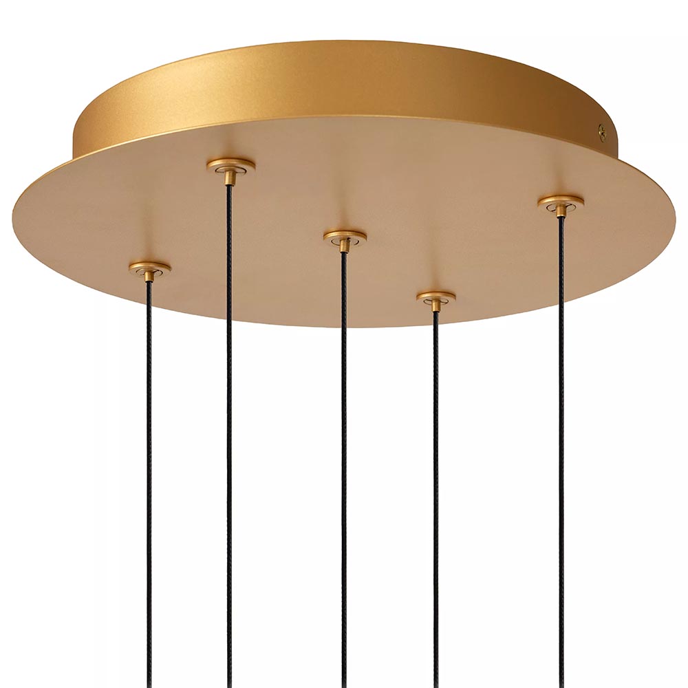 – afm: Ø30×150 cm – kappen: Ø10 cm – bevestiging: Ø30×4 cm – metaal, goud – glas, helder – inclusief LED – 5x 140 lumen – 2700 Kelvin – dimbaar (exclusief)