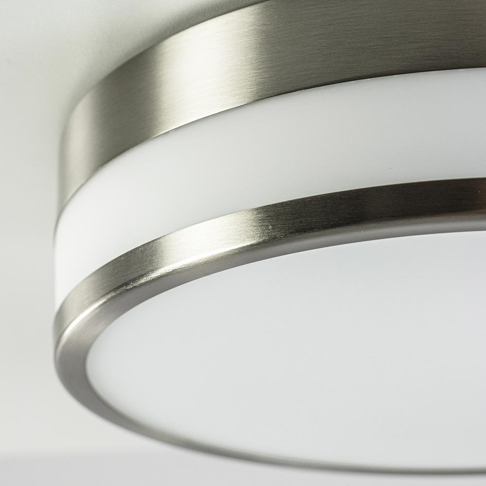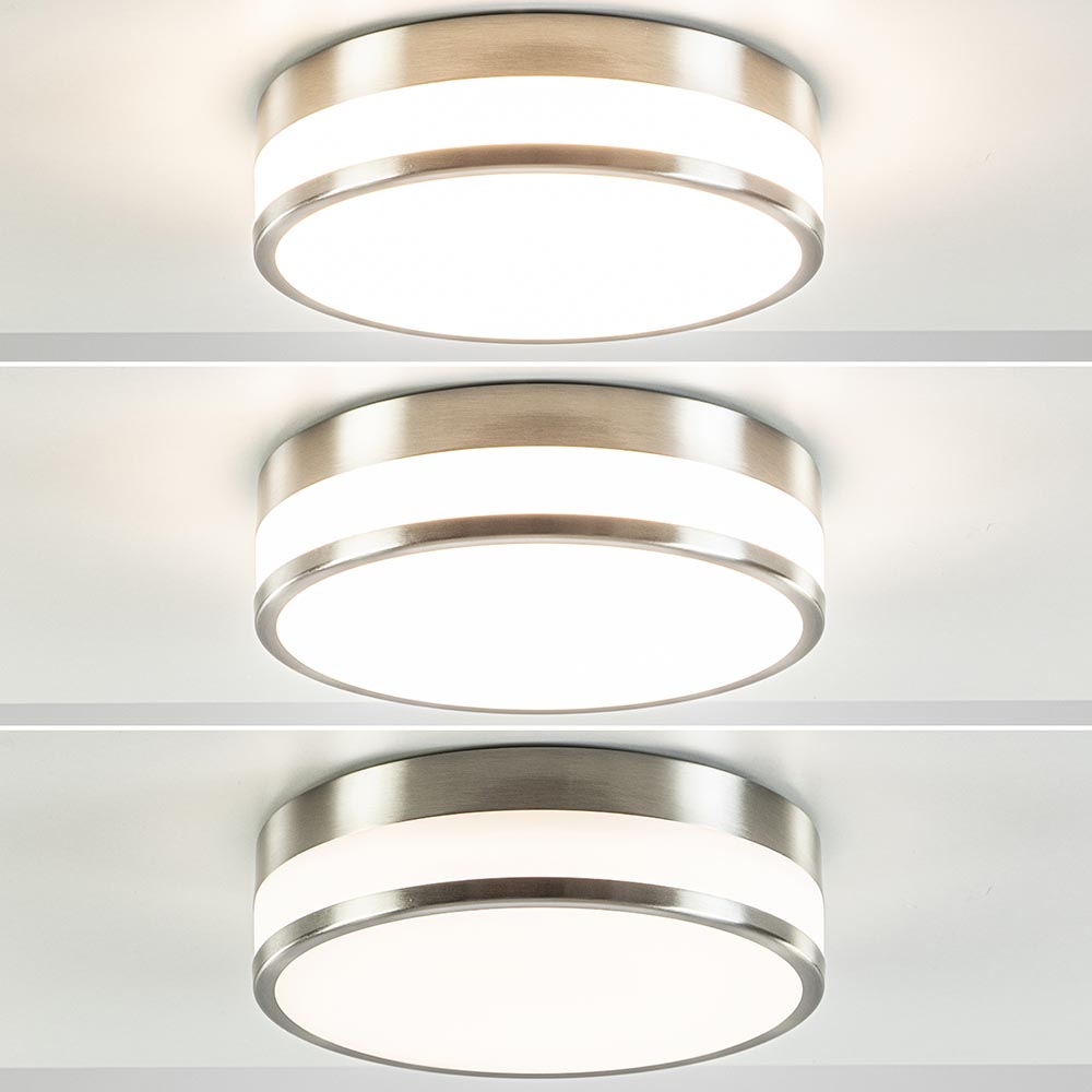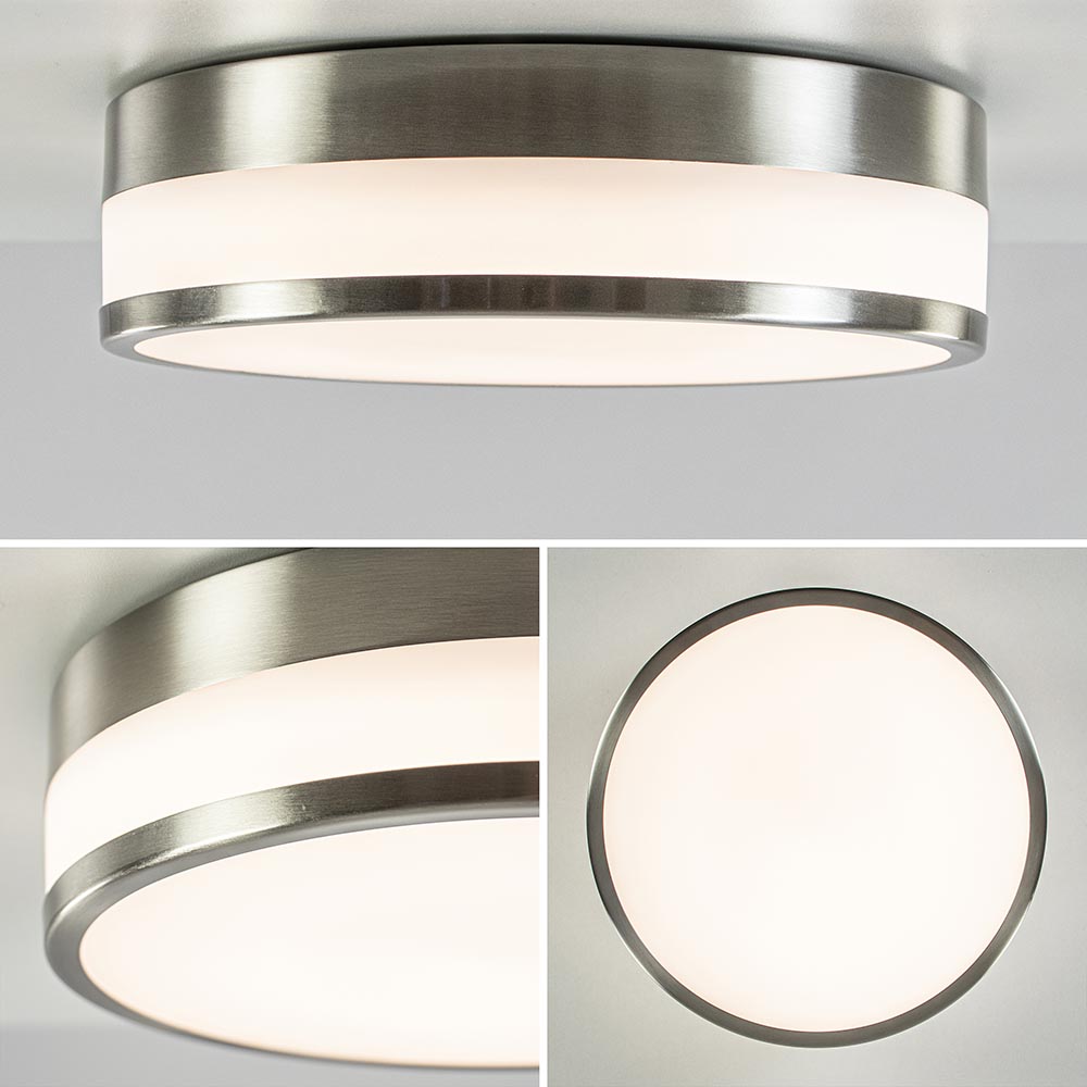 Een moderne plafonnière met een ideale functie. De ronde plafondlamp bestaat uit opaal glas met nikkel en is voorzien van geïntegreerd LED. Voordeel van dit LED, is dat deze in 3 standen is te dimmen. Dit werkt gemakkelijk via de wandschakelaar. U hoeft dus geen externe dimmer te kopen. Met een druk op de knop gaat de lamp in de sterkste stand aan, zet u de lamp direct weer uit en aan, dan dimt de lamp een stap verder, doet u dat nogmaals dan is de lamp in zijn laagste stand. Creëer dus gemakkelijk en snel de juiste sfeer met deze moderne plafondlamp. De nikkel plafonnière is IP44 goedgekeurd zodat deze in de badkamer kan worden toegepast, maar kan ook prima dienen in een ruimte als de hal of keuken. Met 3000 Kelvin zorgt de lamp voor een sfeervolle warm witte verlichting en de 1900 lumen zorgt voor een goede lichtintensiteit, genoeg om een hele ruimte te verlichten.