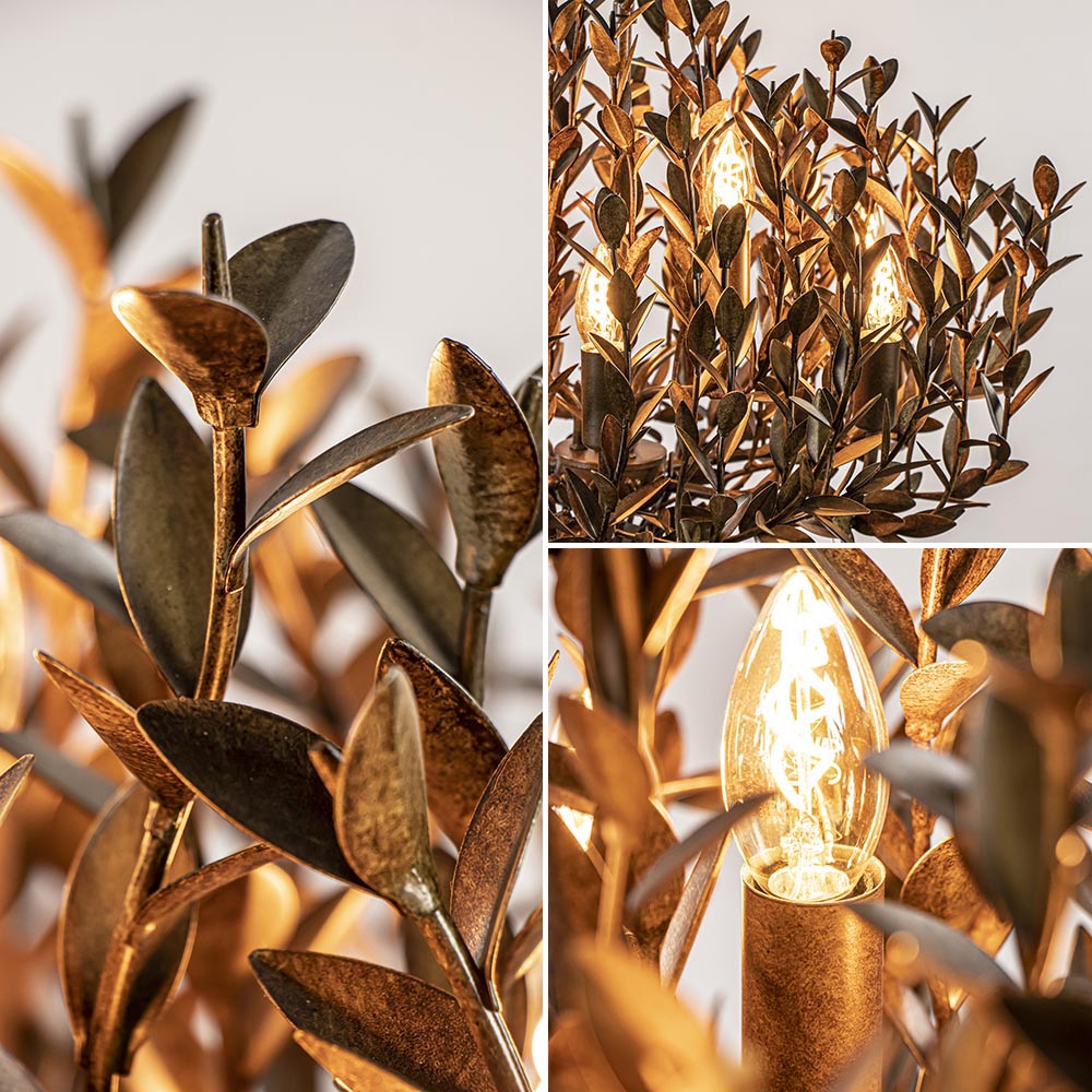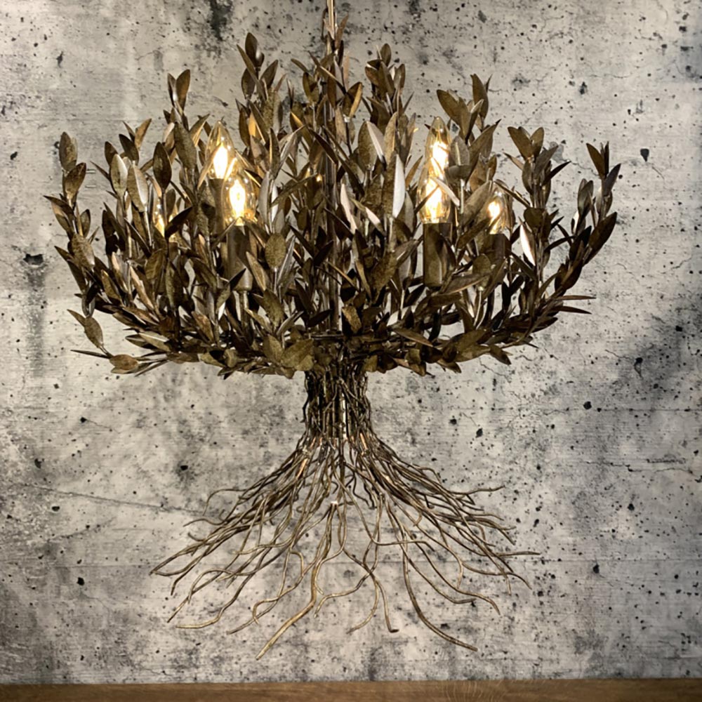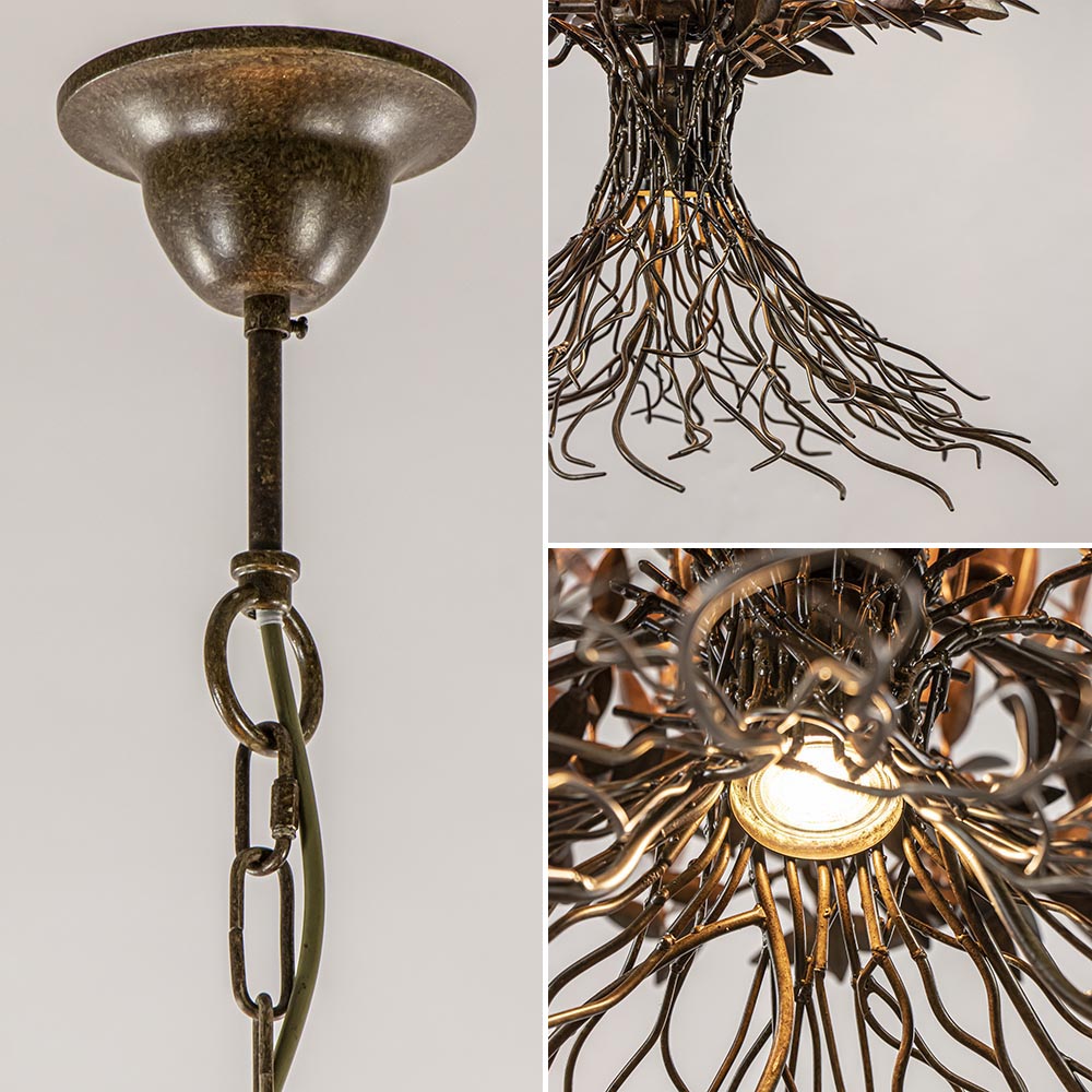 Deze prachtige decoratieve hanglamp is een ware eyecatcher in het interieur. De hanglamp is rond van vorm en volledig gemaakt van metaal in de kleur rustiek (bruin/brons). Dit geeft de lamp een klassieke chique look die mooi past in diverse woonstijlen. De lamp is een mooie toevoeging boven een ronde eettafel, in een vergaderruimte of in een vide. De maximale hoogte van de lamp is 200 cm. De stevige ketting en bevestigingsplaat zijn in dezelfde kleur als de lamp uitgevoerd. De ronde kap bestaat uit allerlei takken die zijn voorzien van blaadjes. Aan de onderzijde van de kap lijken de wortels zich te verspreiden. Tussen de blaadjes zijn negen E14 lichtpunten verspreid en aan de onderzijde is nog een extra GU10 spot te vinden. Deze licht het oppervlakte onder de lamp goed uit. Een prachtig design met een organische decoratieve look.