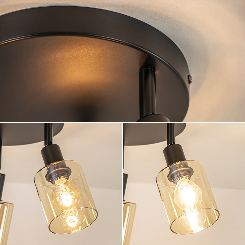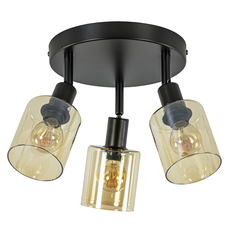 – afm: Ø20×22 cm – bevestiging: Ø20×2,5 cm – kappen: Ø8×13,5 cm – metaal, mat zwart – amber glas – verstelbaar – exclusief lichtbron (3x E14) – dimbaar (exclusief)