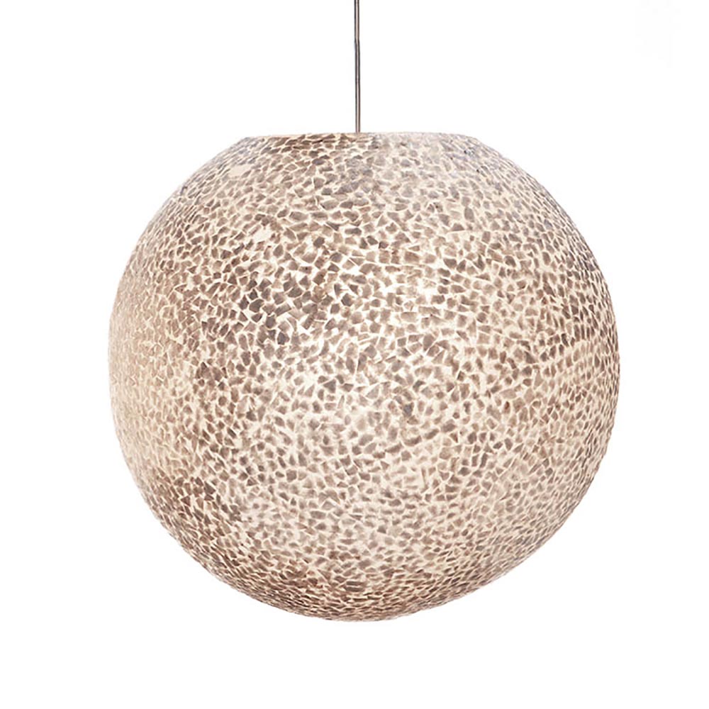Breng een beetje het strand gevoel in huis met deze sfeervolle schelpen hanglamp. De ronde hanglamp met een doorsnede van 50 cm is gemaakt uit een fiberglas mal waar gebroken stukjes capiz schelpen in zijn gelegd. De schelpen zorgen voor een sfeervol effect wanneer de lamp is ingeschakeld. Door de witte/parelmoer schelpen krijgt de kap een frisse moderne uitstraling. De schelpen bol hanglamp hangt aan een transparant snoer die naar wens is in te korten en wordt aan het plafond bevestigd met een ronde nikkel bevestiging. De schelpen hanglamp is een mooi toevoeging aan een hal, slaapkamer of woonkamer. De schelpen hanglamp bol 40 cm wit/parelmoer wordt geleverd zonder lichtbron (E27).