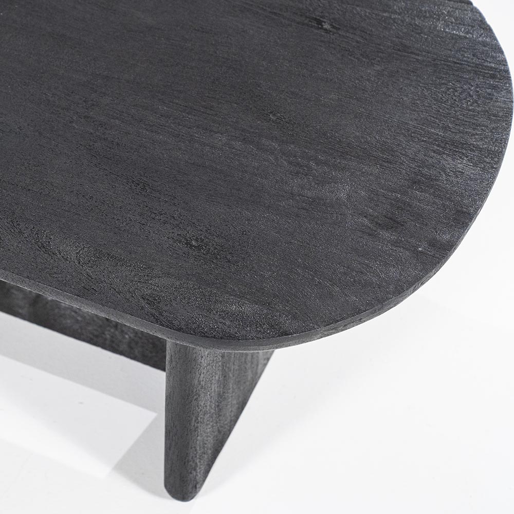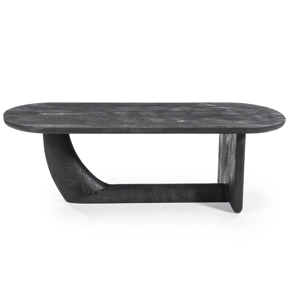 Een moderne salontafel in zwart mangohout met een sculpturale basis die zowel stabiliteit als designkracht uitstraalt.