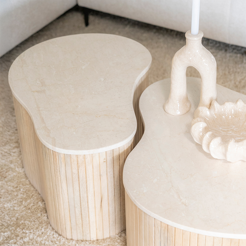 Deze stijlvolle salontafel is een opvallende toevoeging aan elk interieur door zijn organische, zachte vormen en natuurlijke uitstraling. Het prachtige blad van licht marmer geeft deze tafel een luxe, verfijnde look, terwijl de subtiele kleurvariaties en natuurlijke structuur ervoor zorgen dat elk exemplaar uniek is. De elegante, geribbelde houten basis benadrukt het warme en natuurlijke karakter van de tafel en zorgt voor een harmonieus geheel. Dankzij de zachte rondingen is de salontafel gemakkelijk te combineren en ideaal om los of in combinatie met een andere tafel uit de Kira lijn te gebruiken, wat een speels effect creëert. Een elegante eyecatcher voor wie houdt van een interieur waarin natuurlijke materialen en tijdloze elegantie centraal staan. Perfect om jouw woonkamer van een stijlvolle finishing touch te voorzien.