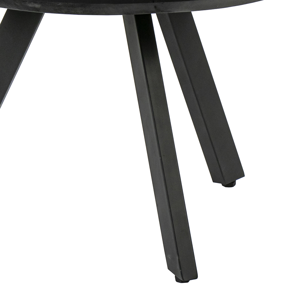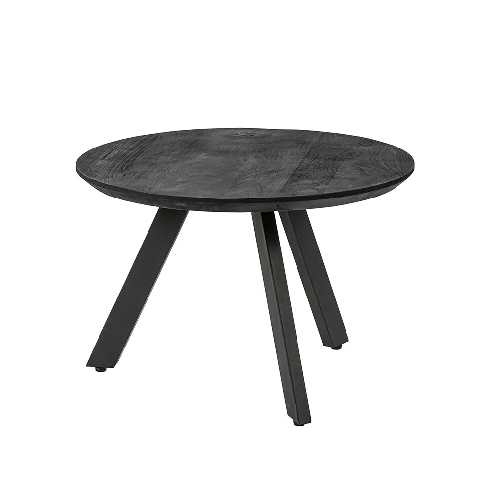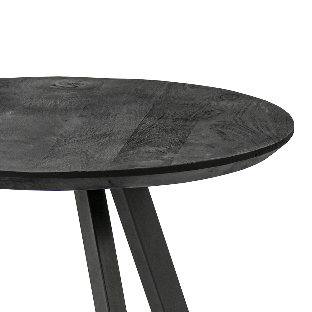 Stoere ronde mangohouten salontafel. Het blad van de salontafel is zwart geverfd. De salontafel heeft 3 metalen mat zwarte poten. Het tafelblad heeft een rond afgewerkte rand. Het blad heeft een dikte van 3 cm. De salontafel komt ook in een grotere versie.