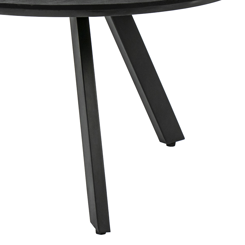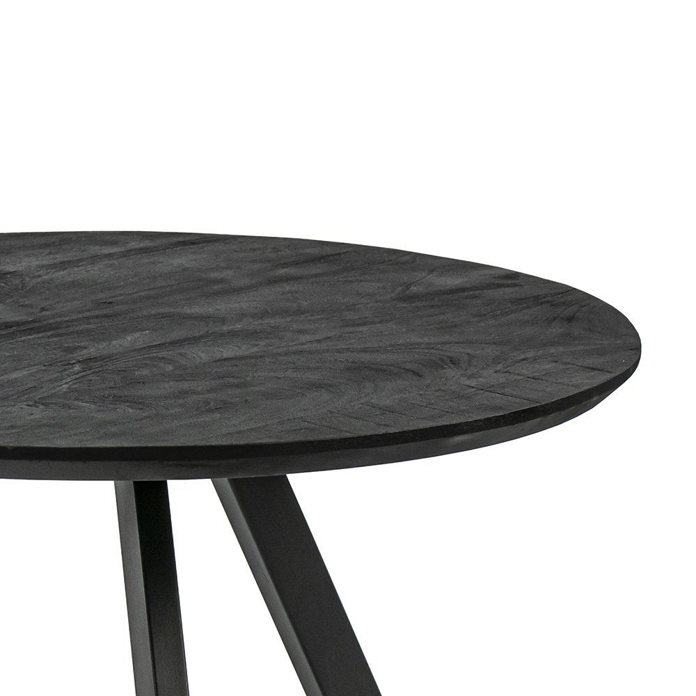 Stoere ronde mangohouten salontafel. Het blad van de salontafel is zwart geverfd. De salontafel heeft 3 metalen mat zwarte poten. Het tafelblad heeft een rond afgewerkte rand. Het blad heeft een dikte van 3 cm. De salontafel komt ook in een kleinere versie.