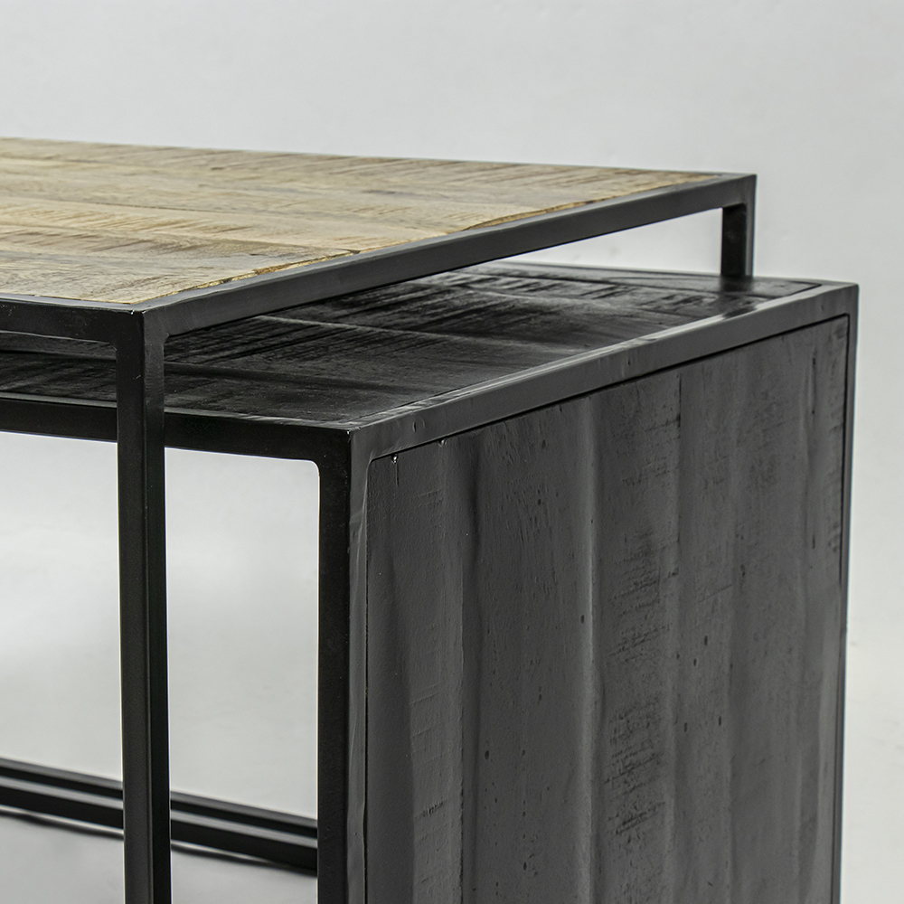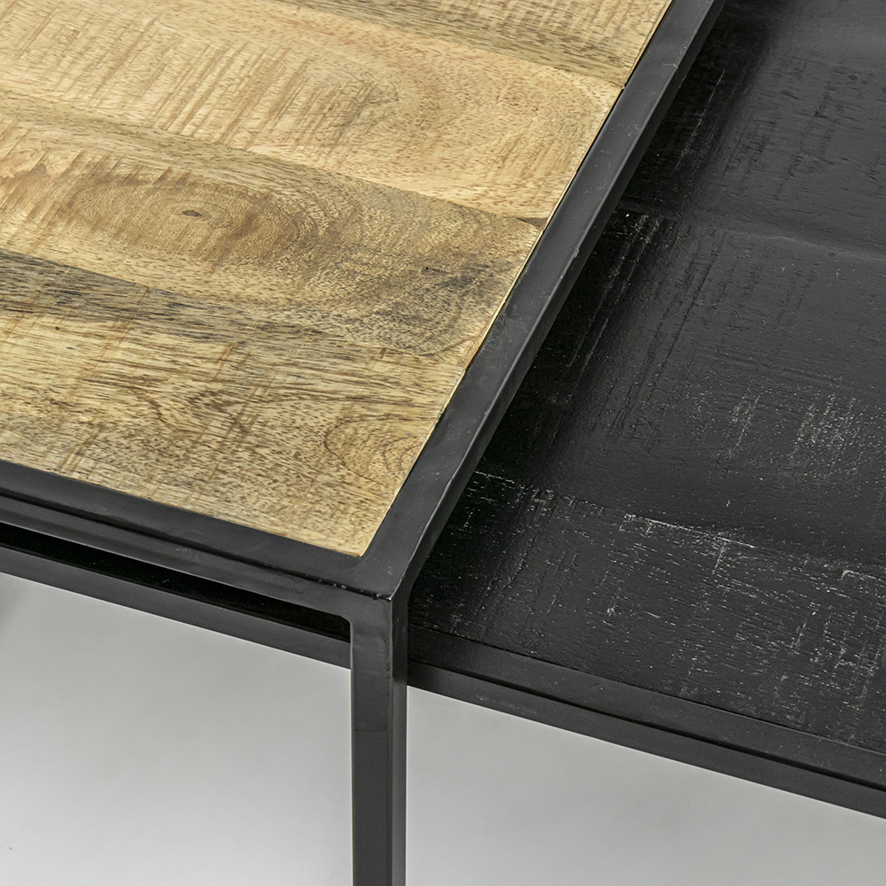 Deze stoere set van twee salontafels zijn van mangohout met een mat zwart metalen frame. De grootste tafel heeft een blad met een natural finish, de kleinste tafel heeft een blad met een sandblasted black finish. Het hout is behandeld en beschermd. Het is af te nemen met een vochtig doekje. De tafels zijn gemakkelijk onder elkaar te schuiven.