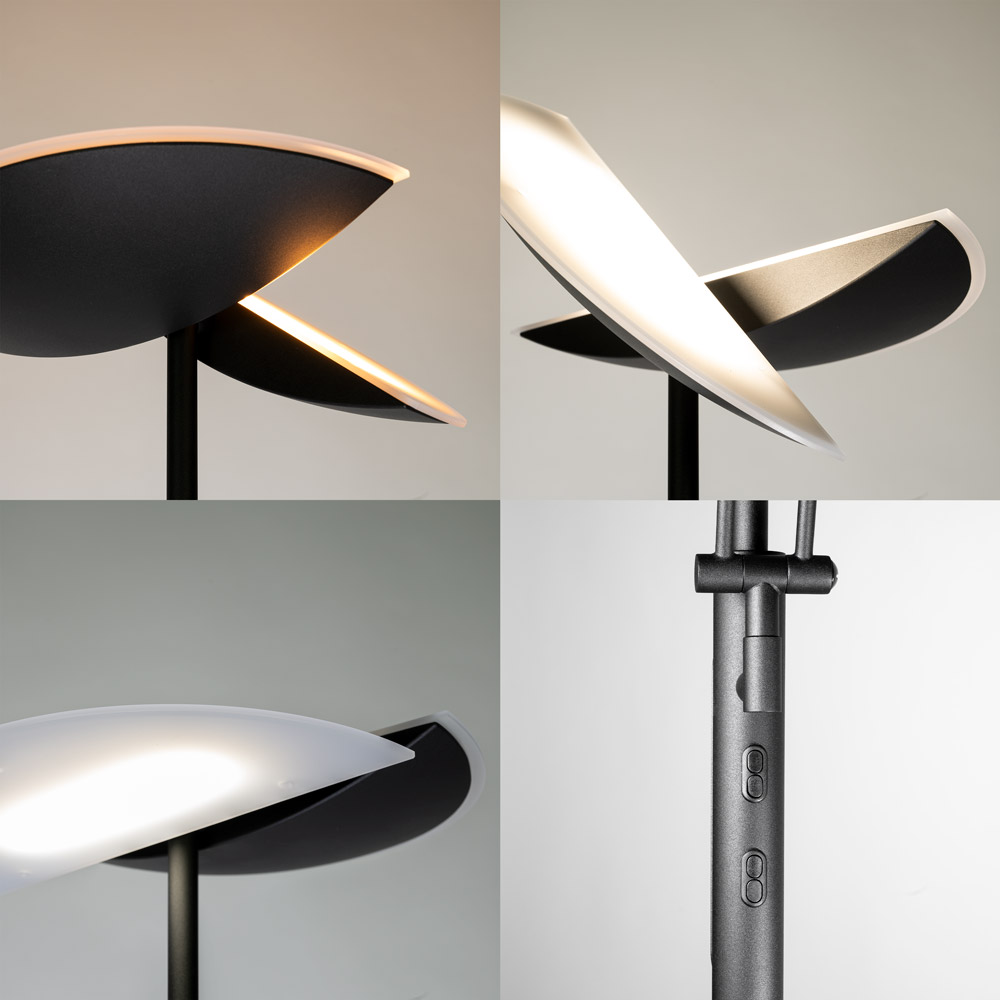 Belangrijkste kenmerken: • Up & down vloerlamp met gescheiden lichtfuncties • Bovenlicht bestaat uit twee afzonderlijk verstelbare lichtdelen • Geïntegreerde LED-verlichting (duurzaam en onderhoudsvrij) • Traploos instelbare lichtsterkte én lichtkleur per lichtpunt • Bediening via knopjes op de lamp • Combineert sfeerverlichting en functioneel leeslicht