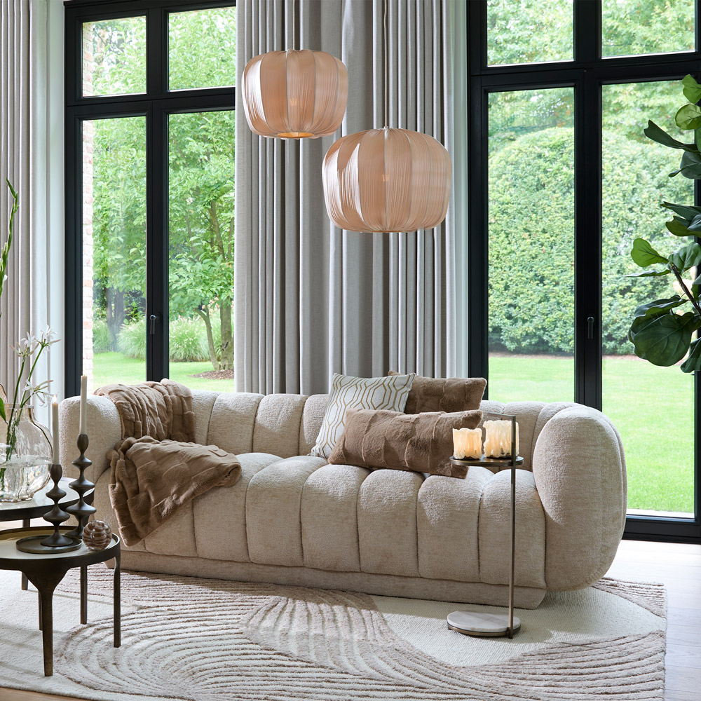 Door de drie beschikbare maten is Savina breed inzetbaar. Kies Ø40 cm voor een kleinere eethoek, slaapkamer of als set boven een bar. De Ø50 cm is ideaal boven een ronde eettafel van circa 120–140 cm, terwijl Ø60 cm perfect past boven een grotere eettafel of als statement lamp in de woonkamer. Het zandkleurige snoer sluit mooi aan bij de lichte tint van de kap en zorgt voor een rustig totaalbeeld.