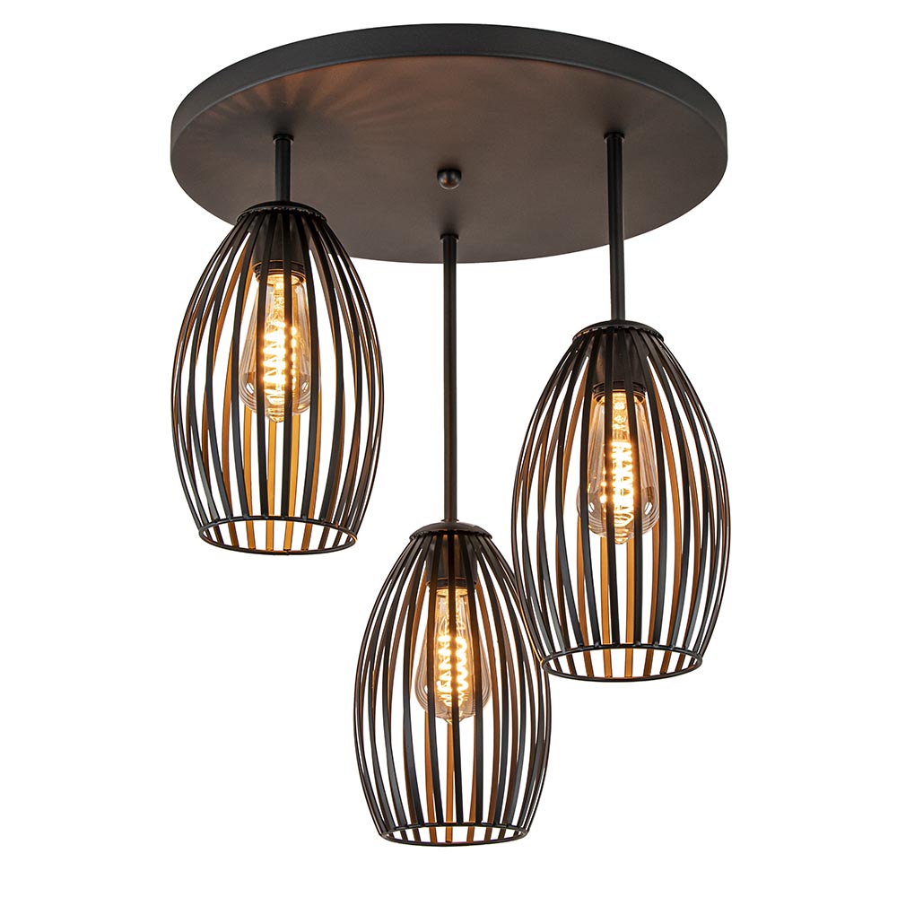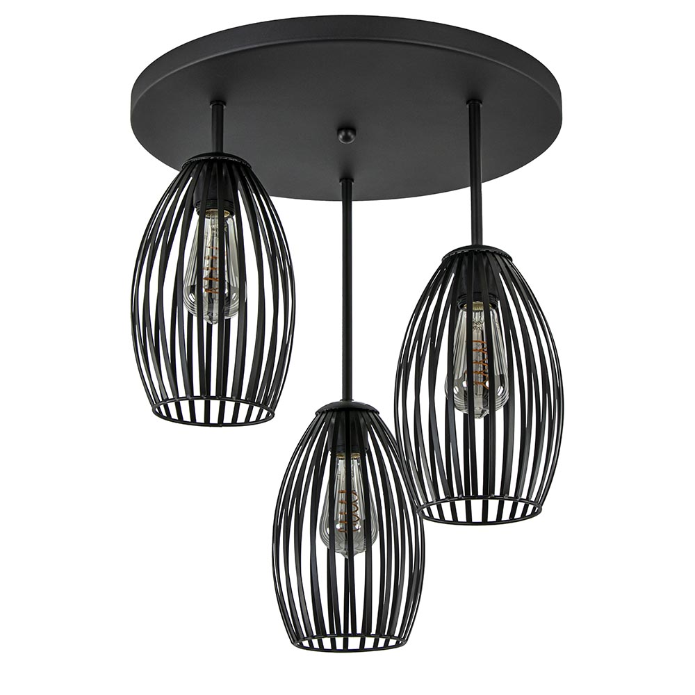 Perfect voor in de woonkamer, slaapkamer of hal. Deze ronde 3-lichts plafondlamp is volledig gemaakt van metaal en afgewerkt met een mat zwarte finish. Het matte zwart zorgt dat de lamp perfect past in een Scandinavisch of modern interieur. De plafondlamp is voorzien van drie draadkapjes met een elegante langwerpige vorm. De kapjes bevinden zich op drie verschillende hoogtes. De draadkappen van deze Scandinavische plafondlamp zijn klein maar zorgen door de open structuur dat er genoeg licht kan worden verspreid. De lichtbronnen zijn exclusief (3x E27).
