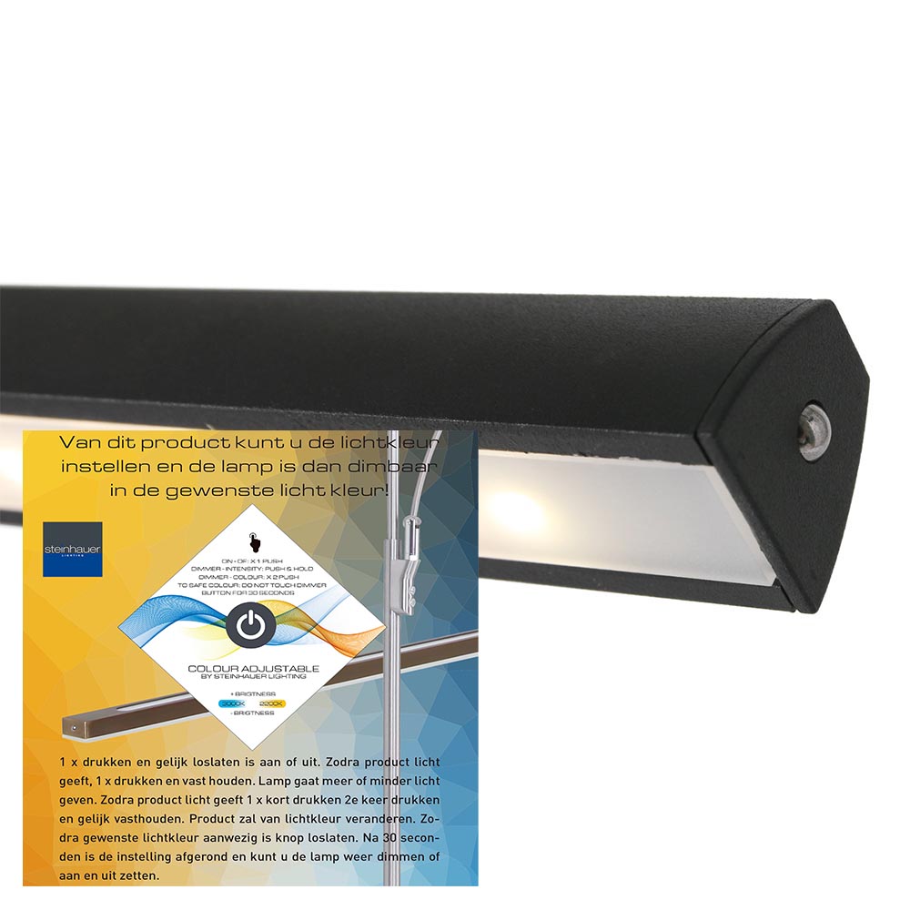 Deze moderne schilderij wandlamp is voorzien van een extra snufje. De wandlamp is voorzien van LED verlichting en gemakkelijk te bedienen door middel van een pushdimmer met diverse functies. Drukt u éénmaal dan gaat de lamp aan of uit, drukt u éénmaal en houdt u de knop ingedrukt, dan dimt de lamp in intensiteit, drukt u tweemaal dan kunt u veranderen in kleurtemperatuur. De kleur wordt onthouden wanneer u de pushdimmer 5 seconden ingedrukt houdt. Zo creëert u gemakkelijk en snel de juiste sfeer en beste verlichting voor boven uw schilderij, mede doordat de kap is te kantelen. De zwarte wandlamp wordt geleverd inclusief zwart snoer van 170 cm.