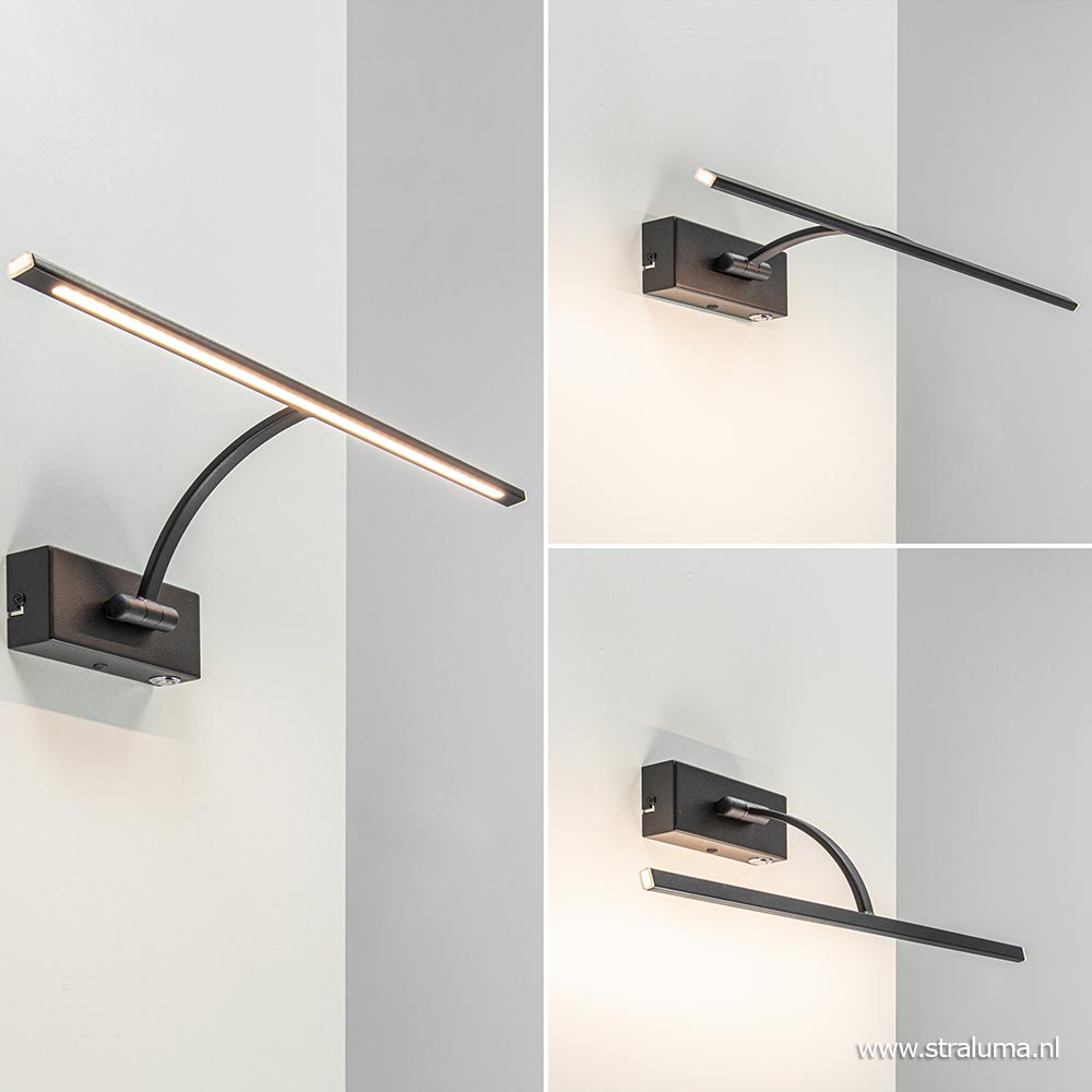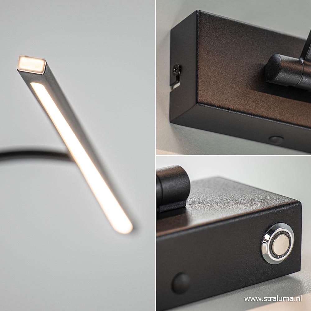 De perfecte wandlamp voor het uitlichten van een schilderij of foto. De moderne schilderijverlichting heeft een strak en minimalistisch design en wordt gemakkelijk op de wand gemonteerd. Ideaal aan de LED lamp, is dat wanneer deze niet direct op een stroompunt kan worden aangesloten, de bevestiging is voorzien van een gat aan de onderzijde zodat er aan snoer aan kan worden gezet. Wordt het gat niet gebruikt, dan is deze netjes afgewerkt met een zwart dopje. Naast deze aansluiting bevindt zich ook de touchdimmer. Met een druk op de knop gaat de lamp aan of uit, houdt u uw vinger langer op de knop, dan dimt de lamp net zo lang tot u weer loslaat. Het mat zwarte armatuur is te kantelen zodat deze de juiste belichting boven een schilderij of foto kan geven. De moderne wandlamp kan ook prima dienen als bedlampje boven het hoofdbord.
