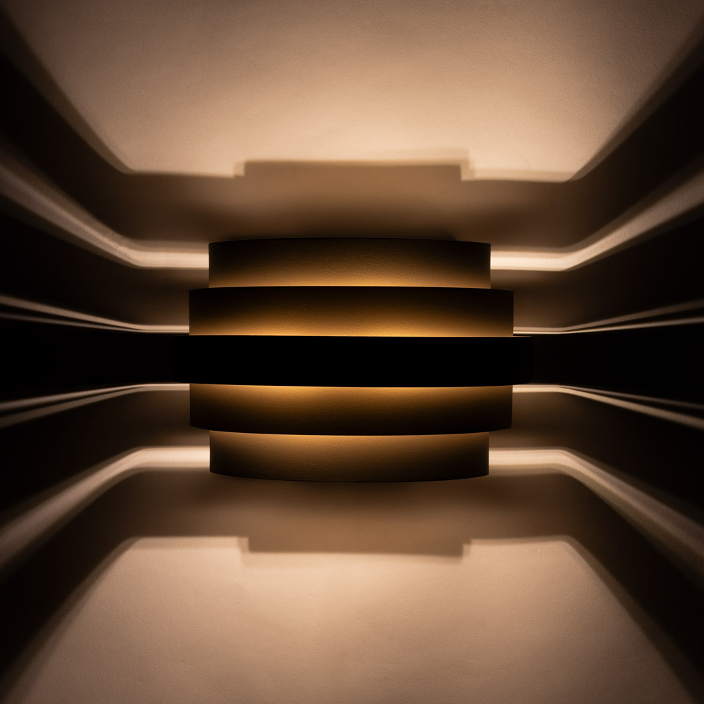 De Scudo wandlamp klein biedt dezelfde karaktervolle uitstraling als de grotere variant, maar in een compacter formaat. Het gelaagde metalen ontwerp laat het licht op een verfijnde manier ontsnappen tussen de ringen, wat zorgt voor een warm en decoratief lichteffect aan de wand.