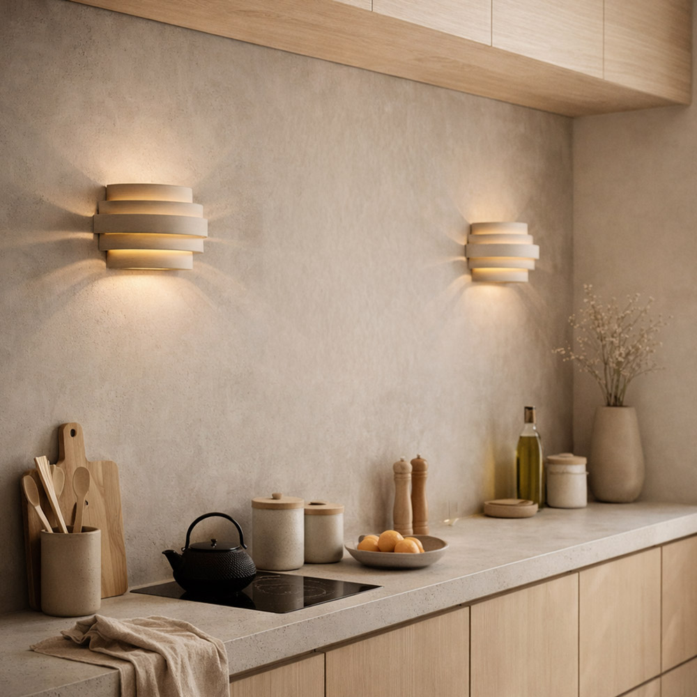 Highlights • Compact wandarmatuur met gelaagd lichtdesign • Zachte zandkleur voor een warme uitstraling • Creëert sfeervol indirect licht • Ideaal voor kleinere wanden of als set geplaatst