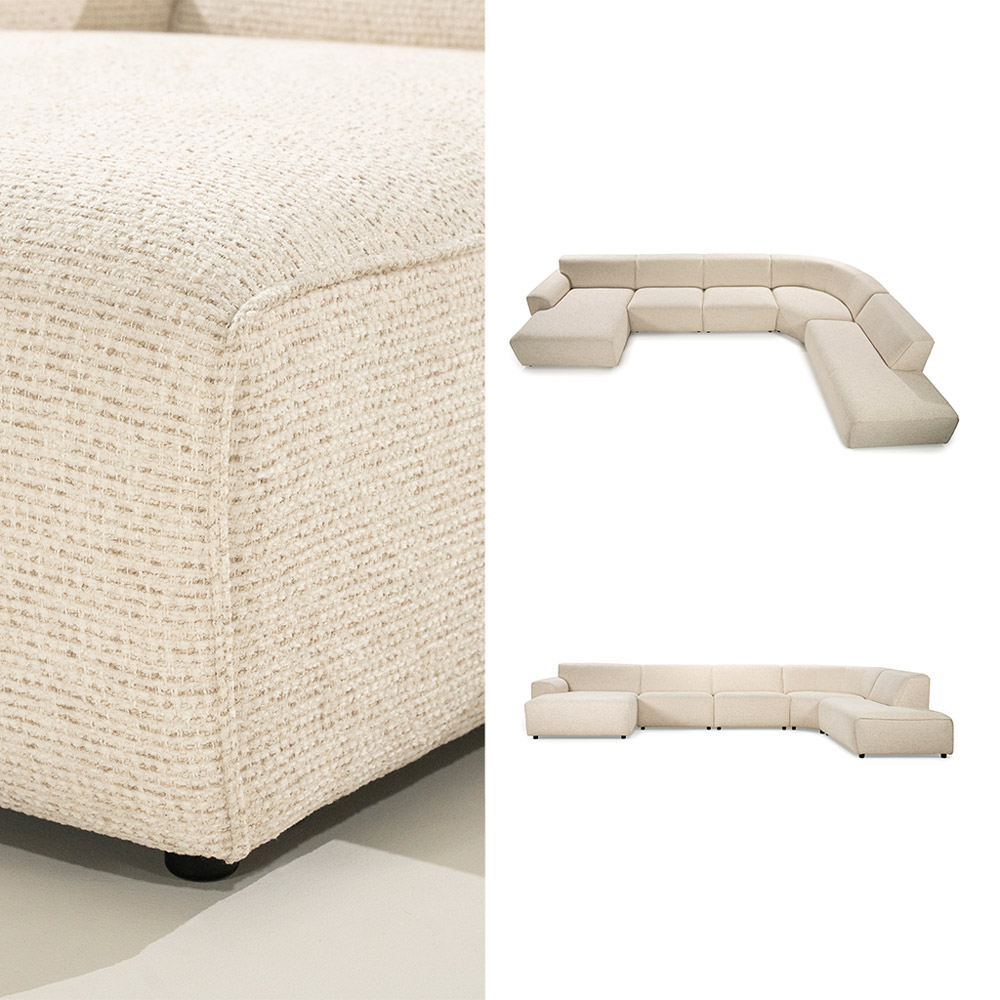 Deze opstelling is uitgevoerd in de stof Silencio – Beige (stofgroep D) en bestaat uit een sofa met arm links, twee 90-elementen zonder armen, een ronde zithoek en een ottomane rechts. De combinatie van rechte modules en afgeronde vormen zorgt voor een speels maar harmonieus geheel.